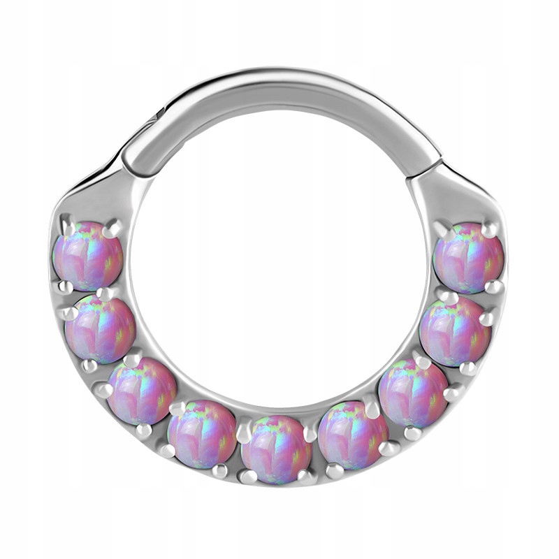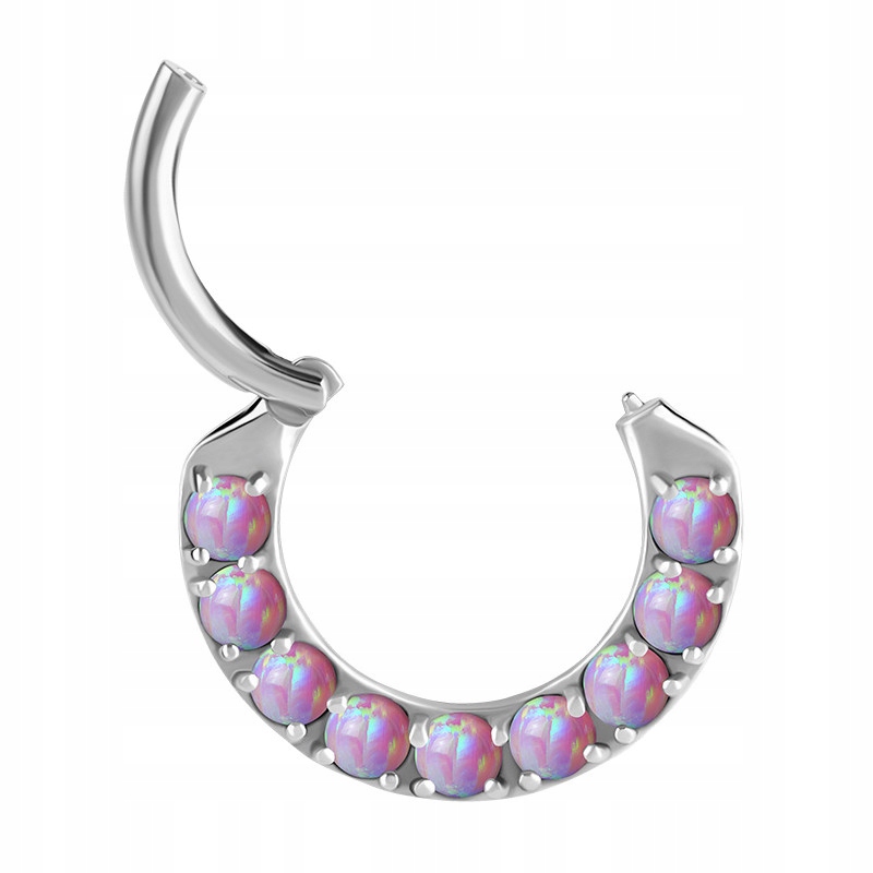 Кільце замикається фрагментом стрижня, закріпленого на шарнірі, виготовленому з безнікелевого кобальто-хромового сплаву. Сережка з одного боку прикрашена виготовленими в лабораторії Рожевими опалами (насправді опали більш білі, мерехтливі рожеві). Використання сережки переважно навколо вуха.