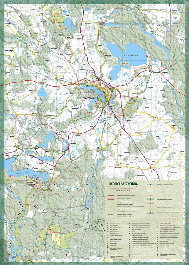 Картографічна частина: туристична карта території Щецинека та Борне-Сулінова, легенда польською, німецькою та англійською мовами.