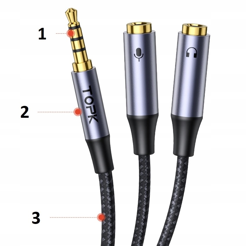 Міні-роз’єм аудіокабелю 3,5 мм (штекер) - 2 міні-роз’єми 3,5 мм (гніздо — навушники + мікрофон) TRRS TOPK OFC