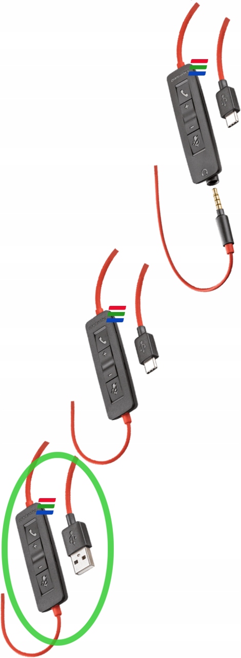 Навушники серії Plantronics Blackwire 3200 доступні в кількох варіантах із різними типами підключення. Пропонована тут версія має кабель із штекером USB-A (позначений зеленим овалом на малюнку вище). Якщо ви шукаєте інший варіант, перегляньте наші інші пропозиції на Allegro або надішліть запит.