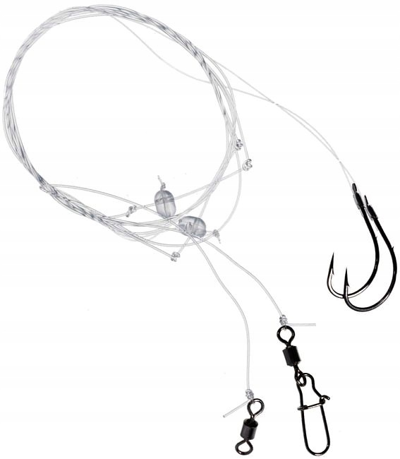 Набір містить два ремені з темні гачки для кріплення наживки, запобіжна шпилька та вертлюг для кріплення набору до основної волосіні та до грузила.