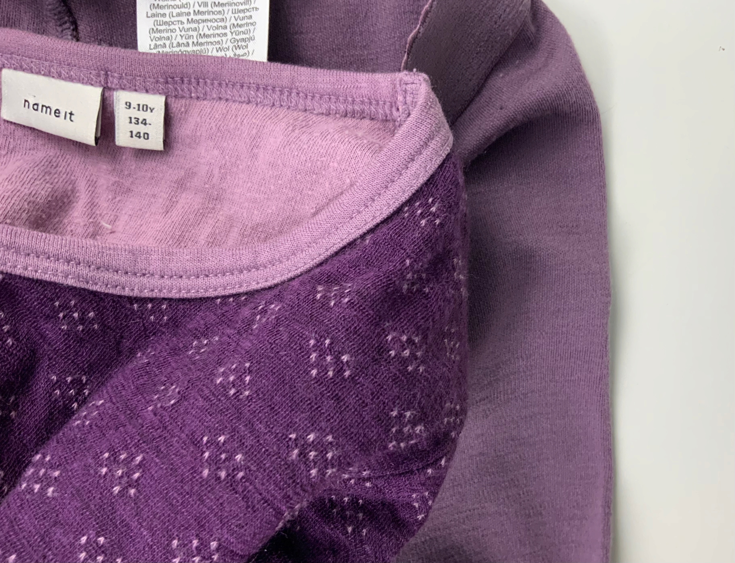 подвійний блуза у кольорі чорничного коктейлю з яскравішим малюнком. Дно рукавів, натиснуті гуми, зморщує рукав і утворює обривання. Напис вишитий срібною ниткою спереду. Світло -чорничні штани. Гумовий ремінь на колінах Latki