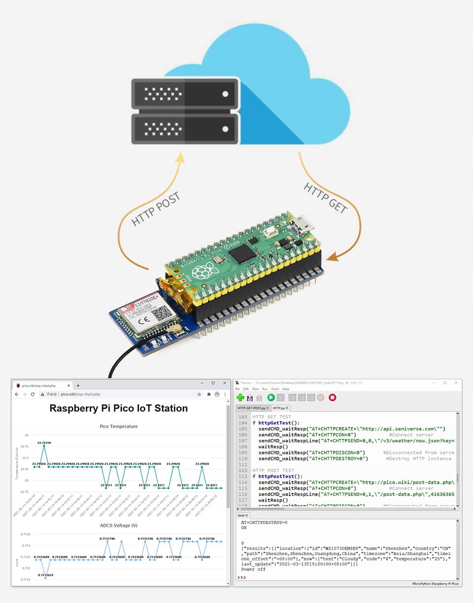 Модуль Pico-SIM7020E-NB-IoT NB-IoT (NarrowBand-Internet of Things), розроблений для Raspberry Pi Pico. Він підтримує кілька діапазонів частот NB-IoT, ним можна керувати за допомогою послідовних команд AT і підтримує протоколи зв’язку, такі як HTTP/MQTT/LWM2M/COAP тощо. Завдяки низькій затримці, низькому енергоспоживанню, низькій вартості та широкому діапазону він це ідеальний вибір для додатків Інтернету речей, таких як розумні інструменти, відстеження активів, віддалений моніторинг тощо.