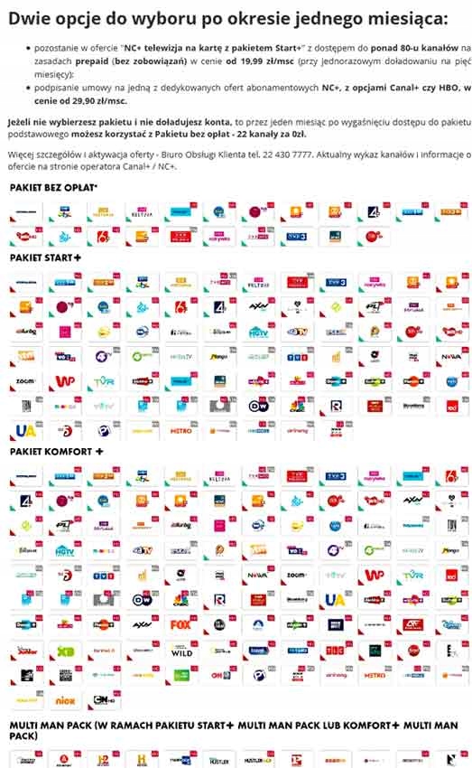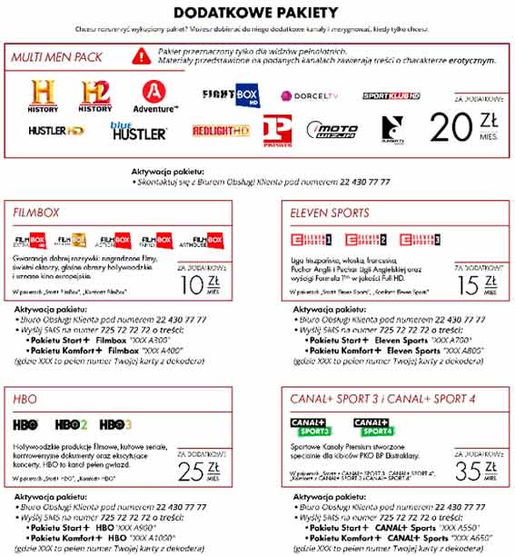 BBC HD, FOX HD, AXN HD, TVN Fabuła (HD), Paramount Channel HD, nSport+ HD, Eurosport 1 HD, Active Family, Da Vinci Learning, Disney Junior, Disney XD, Disney Channel HD, Food Мережа (HD), BBC Brit (HD), TLC HD, TVP HD, Trace Urban, E! Entertainment HD, MTV Polska HD, CBS Reality, Discovery Life, Crime+Investigation Polsat, Discovery Channel HD, NatGeo Wild HD, National Geographic HD, Travel Channel HD, CNN International.
