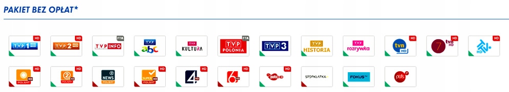 BBC HD, FOX HD, AXN HD, TVN Fabuła (HD), Paramount Channel HD, nSport+ HD, Eurosport 1 HD, Active Family, Da Vinci Learning, Disney Junior, Disney XD, Disney Channel HD, Food Мережа (HD), BBC Brit (HD), TLC HD, TVP HD, Trace Urban, E! Entertainment HD, MTV Polska HD, CBS Reality, Discovery Life, Crime+Investigation Polsat, Discovery Channel HD, NatGeo Wild HD, National Geographic HD, Travel Channel HD, CNN International.