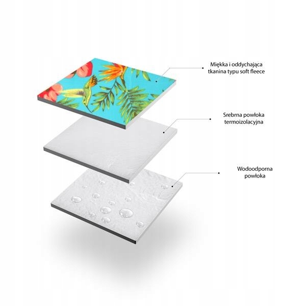 Ковдра виконана з двох шарів матеріалу. Верх - зручний матеріал Polar, який забезпечує комфорт використання. Нижній шар виконаний з водонепроникного алюмінієвого покриття. Обидва ці матеріали створюють чудовий теплоізоляційний шар.