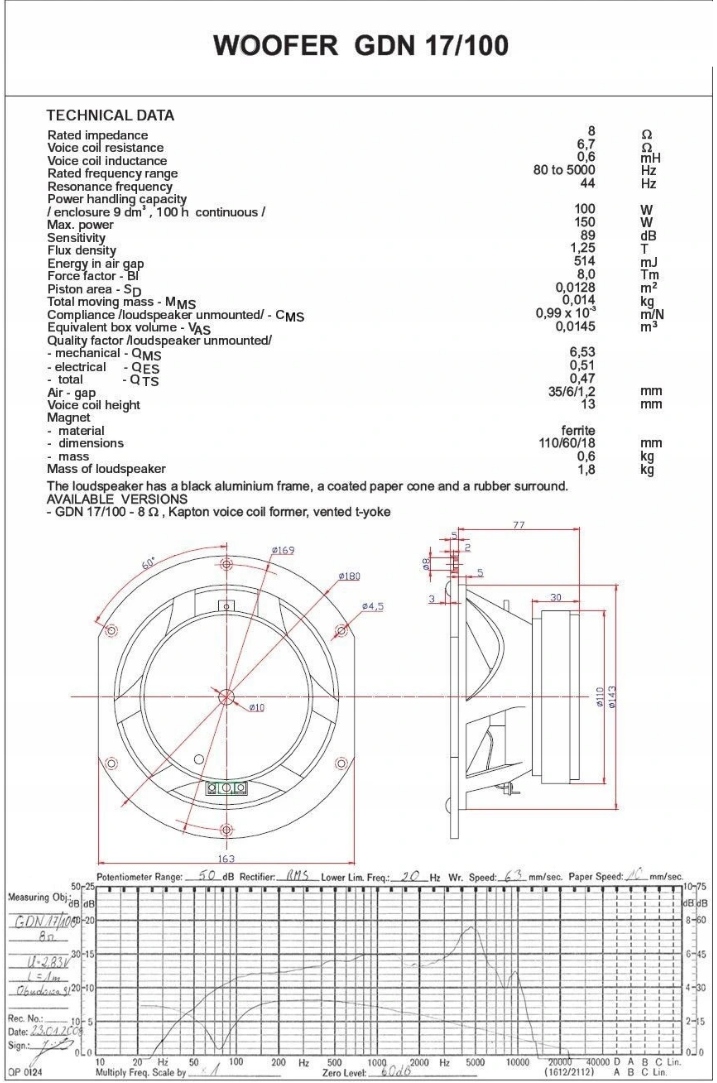 Новий низькочастотний динамік у пропозиції Tonsil. Гучномовець побудований на дуже жорсткому алюмінієвому кошику. Магнітопровод з використанням магніту 11 см дозволяє створити в зазорі індукцію 1,25 Т. Завдяки цьому котушка 35 мм добре охолоджується. Номінальна потужність, виміряна відповідно до стандарту IEC, становить 100 Вт. Перетворювач має дуже добре збалансовані параметри, що дозволяє йому працювати в двосторонній системі з низькою нижньою граничною частотою та дуже читаним діаметром. Його також можна використовувати як типовий низькочастотний динамік у трисмуговій системі, що забезпечує низькі та чисті баси. Ці характеристики роблять його дуже конкурентоспроможною пропозицією на ринку, зберігаючи доступну ціну. Гучномовець використовується в високоякісних гучномовцях.