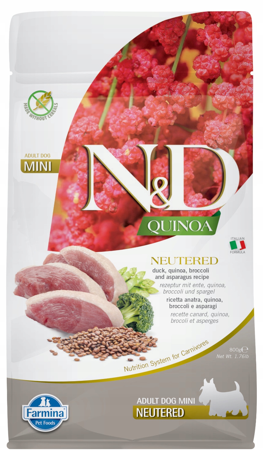 Качка, кіноа, броколі, спаржа, повнораціонний корм для стерилізованих собак дрібних порід.