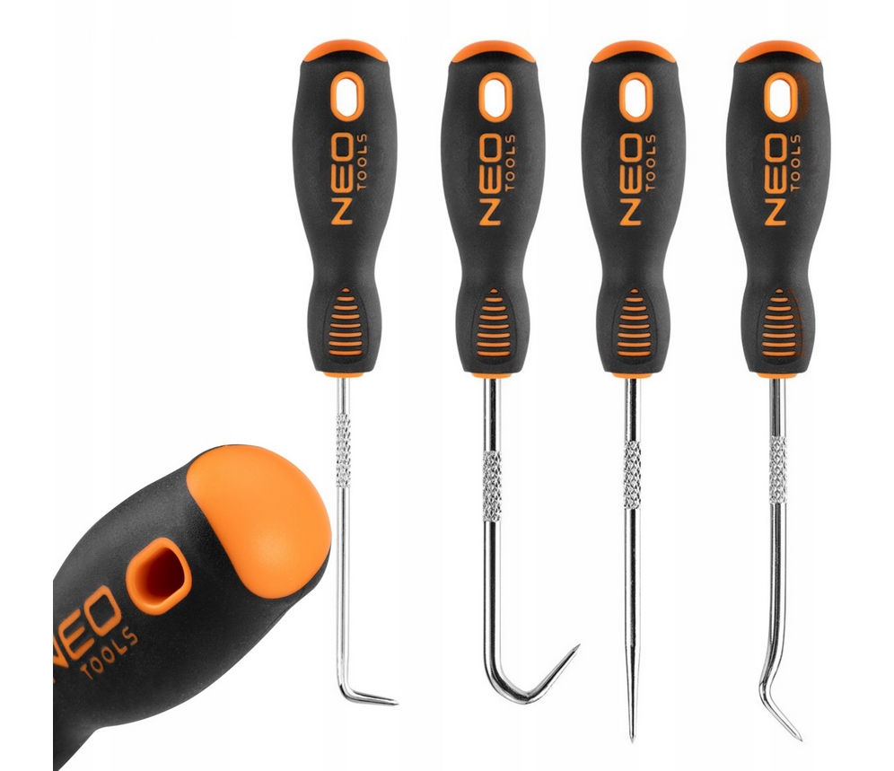 - Гаки 150 мм, набір 04-231 фірми NEO - це набір з чотирьох інструментів довжиною 150 мм, призначений для зняття пломб. Мають зручну ручку викрутки трикутної ергономічної форми. Крім того, він має профільований упор для великого пальця, що знижує навантаження на руку під час виконання завдань і забезпечує свободу дій. Наконечник виготовлений з вуглецевої сталі, а ручка покрита матеріалом TPR - стійким до хімікатів, жиру та мінеральних масел. Набір гачків від торгової марки NEO призначений для механіків, будівельників і любителів DIY
