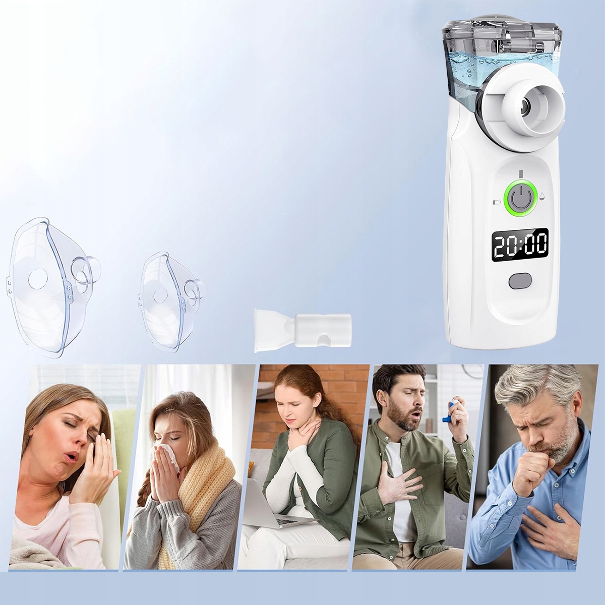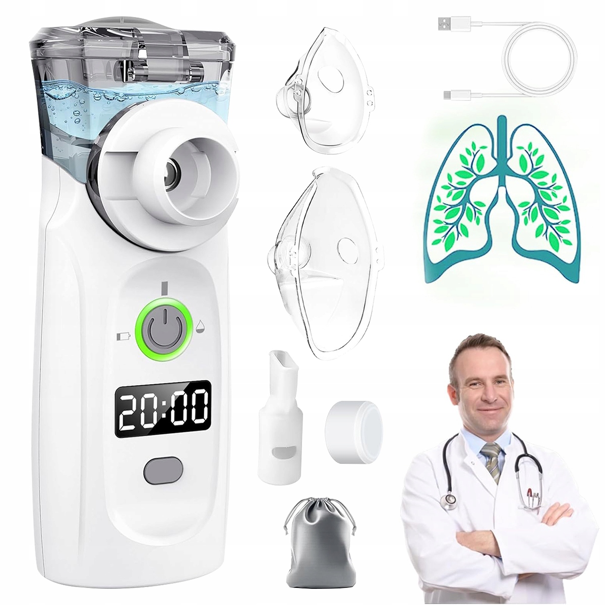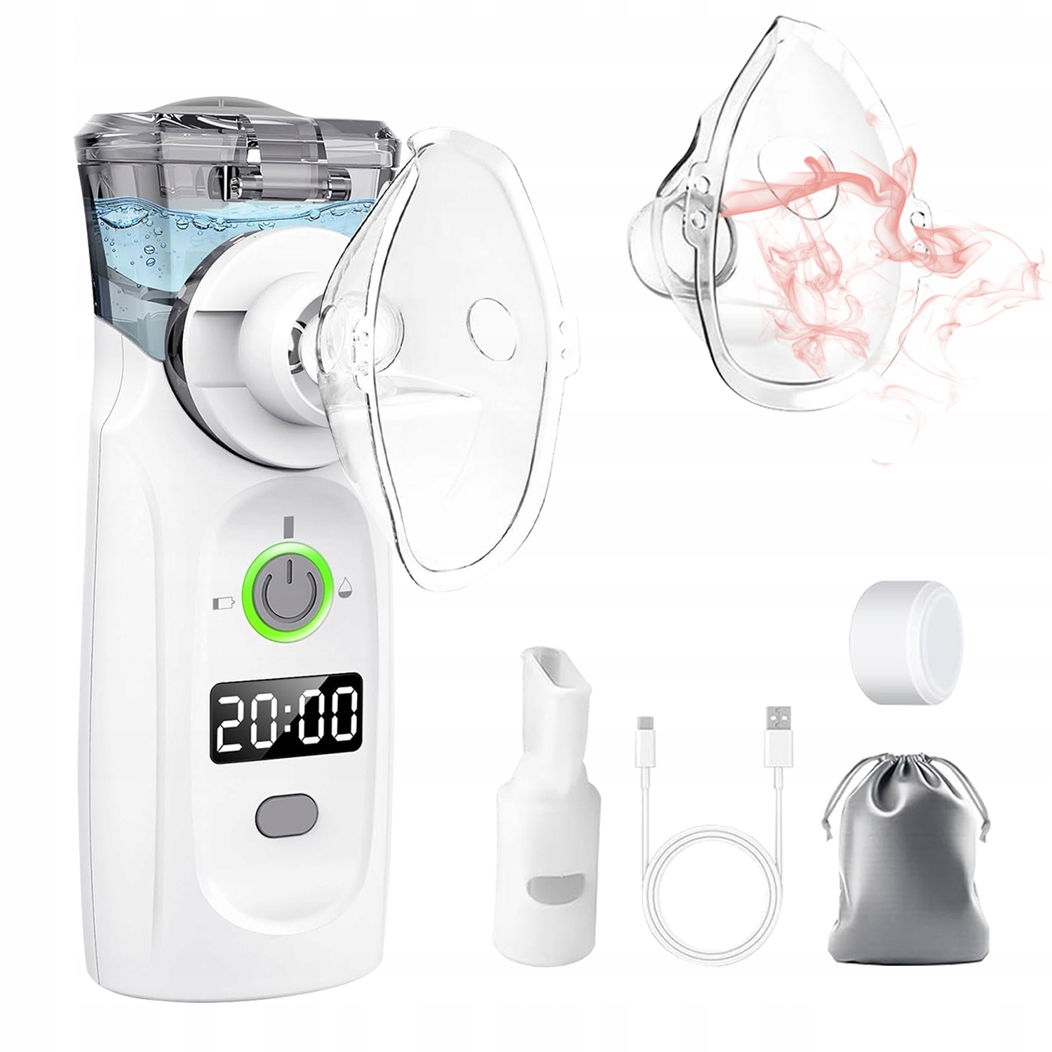 Портативний небулайзер із USB-зарядкою, таймером і дисплеєм, небулайзером, маскою та мундштуком для дітей і дорослих (білий)