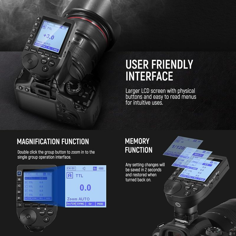 Покращено тригер бездротового спалаху QPRO-C для камер Canon є потужним і повністю підтримуєавтомат спалах (TTL), компенсація експозиції спалаху (FEC)швидк синхронізація 1/8000 с, стробоскоп, ручний спалах, функція масштабування, керування лампою групової моделі, груповий зум, одноточковий тригер і одночасні налаштування виведення для всіх груп. Швидко Синхронізація 1/8000s дозволяє збільшити швидкість затвора ідеально підходить для об’єктів, що швидко рухаються, а також підтримує функція підсвічування автофокусування світиться при слабкому освітленні, коли камера не може сфокусуватися фокус.