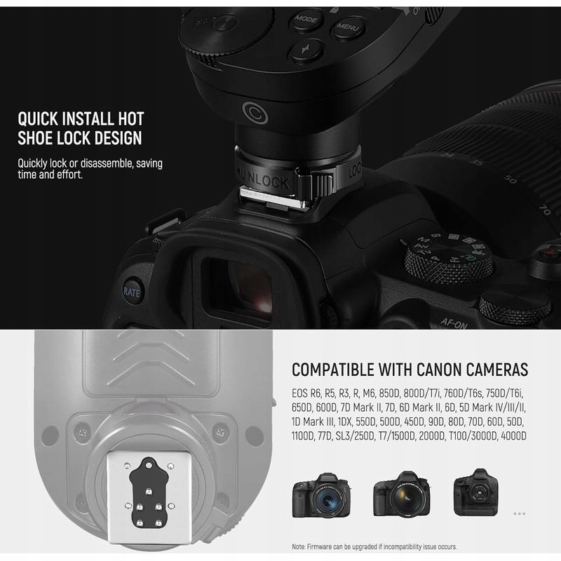 - Сумісність із Canon EOS R6, R5, R3, R, M6, 850D, 800D/T7i, 760D/T6s, 750D/T6i, 650D, 600D, 7D Mark II, 7D, 6D Mark II, 6D, 5D Mark IV/III/II, 1D Mark III, 1DX, 550D, 500D, 450D, 90D, 80D, 70D, 60D, 50D, 1100D, 77D, SL3, T7/1500D, 2000D, T100, 3005Datd.