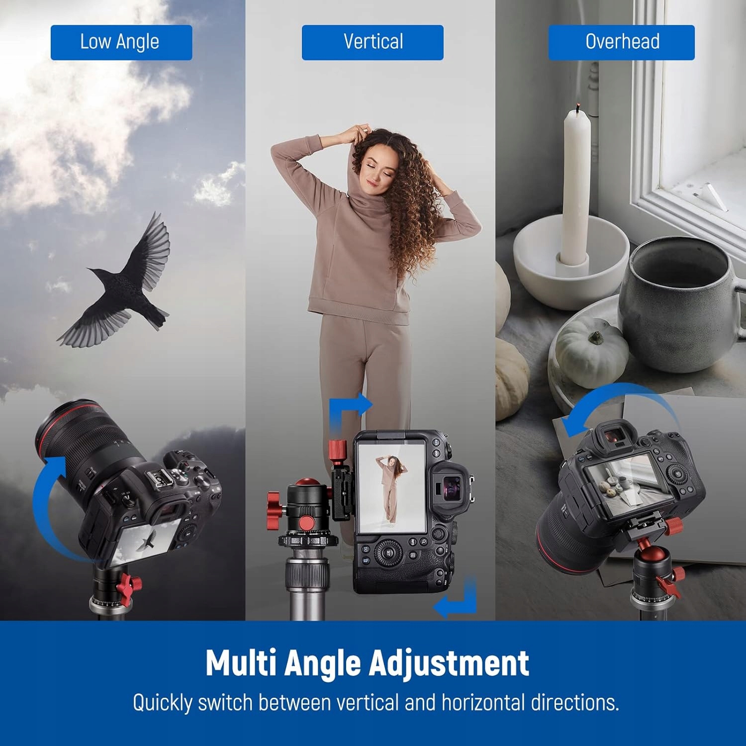 *Продукт має ніжні подряпини та вм'ятини, видимі в останньому фотографії. Голова штатива підтримує панорамну фотографію, захищаючи камеру на штативі. Головка з обертовою кулею легко нахиляється, що дозволяє фотографувати під різними кутами, незалежно від того, чи є вертикальна, рівна чи верхня. Голова штатива легко підходить до всіх моделей штативів та монопод