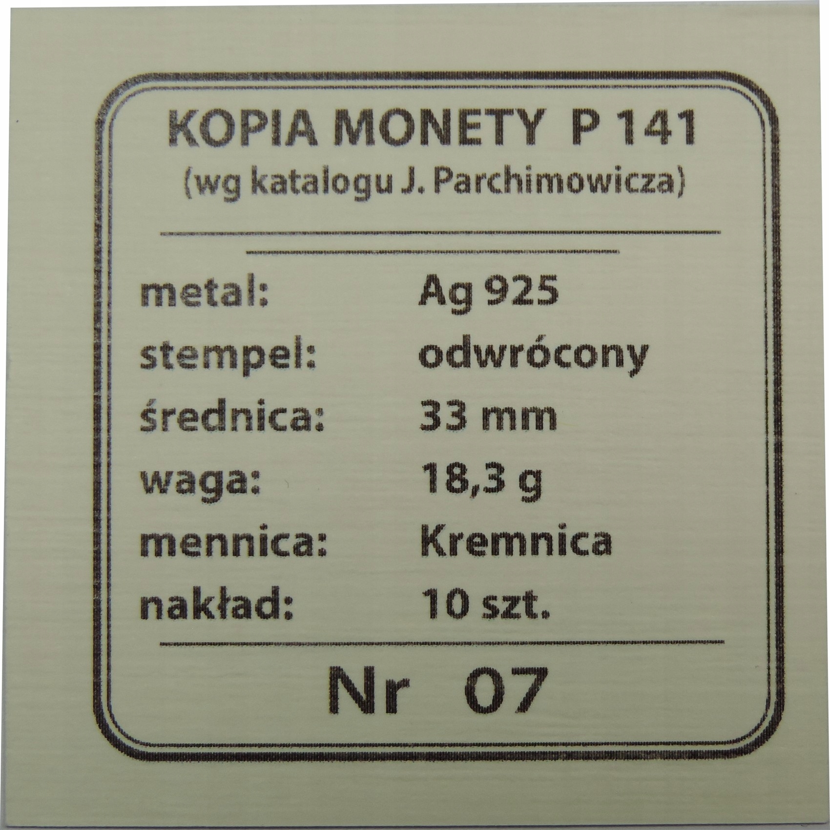 НЕФРИТ - РЕПЛІКА - КОПІЯ ДОВОЄННОЇ ПРОБНОЇ МОНЕТИ - СРІБЛО 925 ПРОБИ