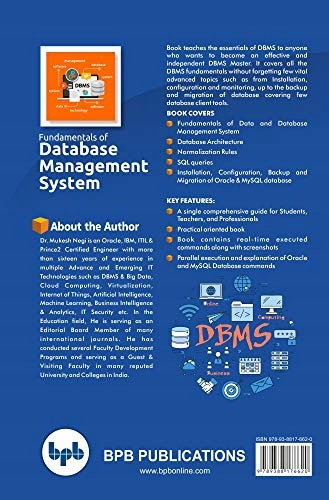 Розроблений для того, щоб забезпечити уявлення про виконані командування на клавіатурі бази даних, а також екзюрування паралельного виконання та пояснення командування Oracle та MySQL для студентів, викладачів та професіоналів, що займаються практичним орієнтацією книги, навчає основних значень DBM для кожного, хто хоче стати ефективним та незалежним майстром DBM. Він охоплює всі основи СУБД з нормалізацією бази даних SQL, SQL-запитами, SQL приєднують сукупні функції, Oracle та MySQL, які ця книга є формдентами політехнічних/ комп'ютерних/ комп'ютерних класів-комп'ютерів-MSSC (CS/ IT)/ MCA/ M. Професіонали галузі- підготовка до таблиці сертифікатів змістоводних даних та нормалізації технології бази даних та моделей реляційної бази даних та нормалізації технологій бази даних та моделей SQL та відновлення бази даних, приєднуються Інженер із шістнадцяти років досвіду роботи в галузі багатопереджальних та нових ІТ -технологій, таких як СУБД та великі дані, хмарні обчислення, віртуалізація, Інтернет речей, штучна інтелект, машинне навчання, бізнес -розвідка та аналітика, ІТ -безпека тощо в галузі освіти, він виступає членом редакції багатьох міжнародних журналів. Він провів кілька викладачів та виконував посаду гостей та відвідувачів у багатьох відомих університетах та коледжах Індії.