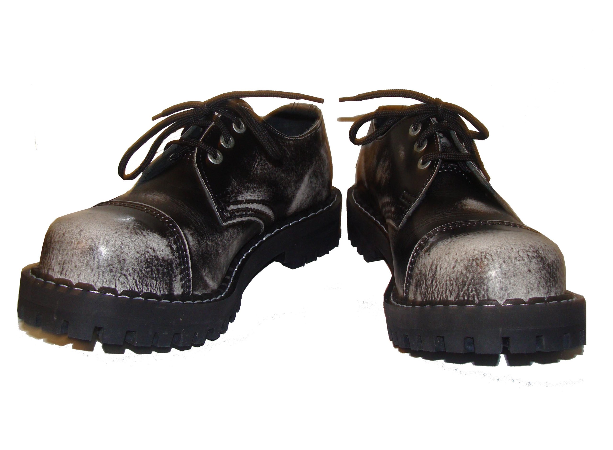 Класична модель із трьома отворами з колекції взуття N-Steel. Виготовлений повністю з високоякісної натуральної зернистої шкіри, втертої в білий і чорний кольори. Двошарова підошва, укріплена гвинтами, виготовлена ​​з термогуми, стійкої до розриву, розтріскування та стирання, підбита вставкою, яка ідеально ізолює ногу від землі та забезпечує чудовий комфорт використання. Так званий кінчик черевика «шапка» загартований листовим металом. УНІКАЛЬНЕ.