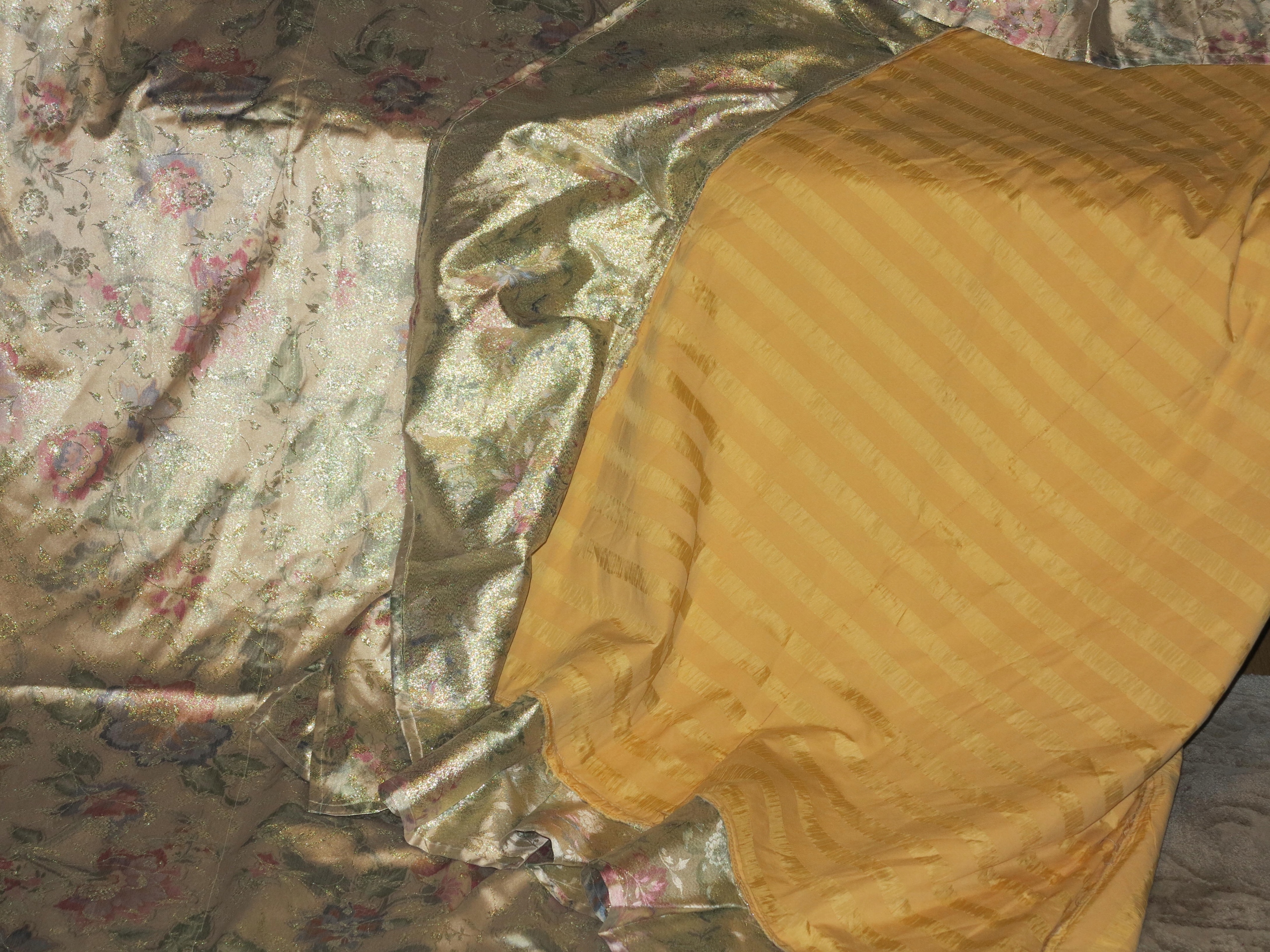 НАДЗВИЧАЙНЕ КРАСИВЕ АНГЛІЙСЬКЕ ПОКРИВАЛО ДЛЯ СТИЛЬНОГО ІНТЕР'ЄРУ, ЩО ПЕРЕЛИВАЄ РЯЧНИМ ЗОЛОТИМ ПЕРЕЛИВОМ. ЗОЛОТИСТИЙ БЕЖЕВИЙ КОЛІР, КВІТКОВІ ВИЗЕРУНКИ БЛІДО-РОЖЕВОГО ТА ЗЕЛЕНОГО. ЗАГАДКА НА ТРИ БОКИ. ОБШИТАНА ЗНИЗУ ДОДАТКОВИМ ШАРОМ МАТЕРІАЛУ. Є ДВА ОРИГІНАЛЬНИХ СИМЕТРИЧНИХ СПІКІВ ТКАНИНИ ЧЕРЕЗ ЦЕНТР