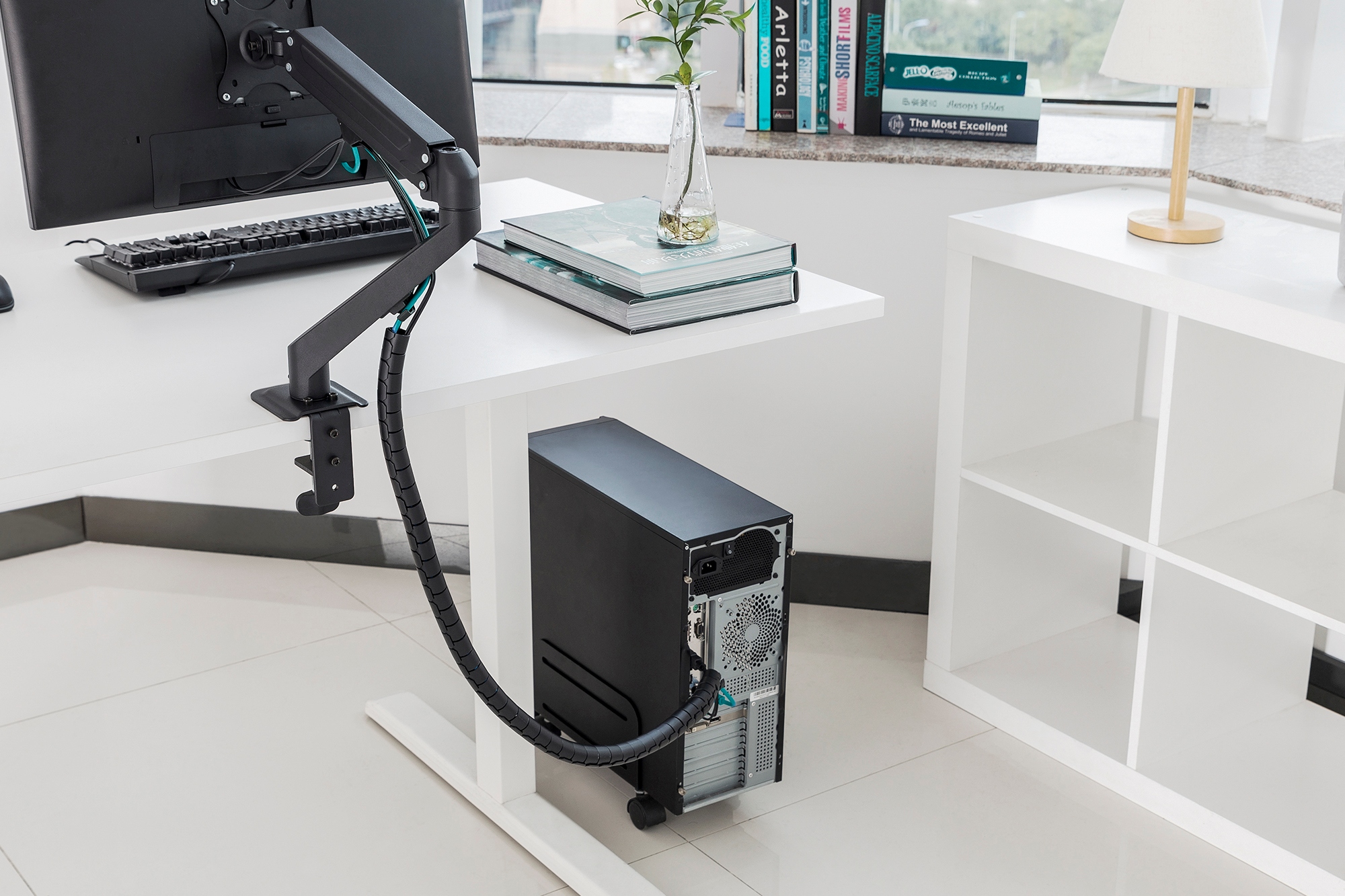 Виріб значно полегшує приховування кабелів на задній частині столу, шафи чи комода. Кабелі заховані в пластикову кришку, тому вони займають менше місця і не збирають пил.