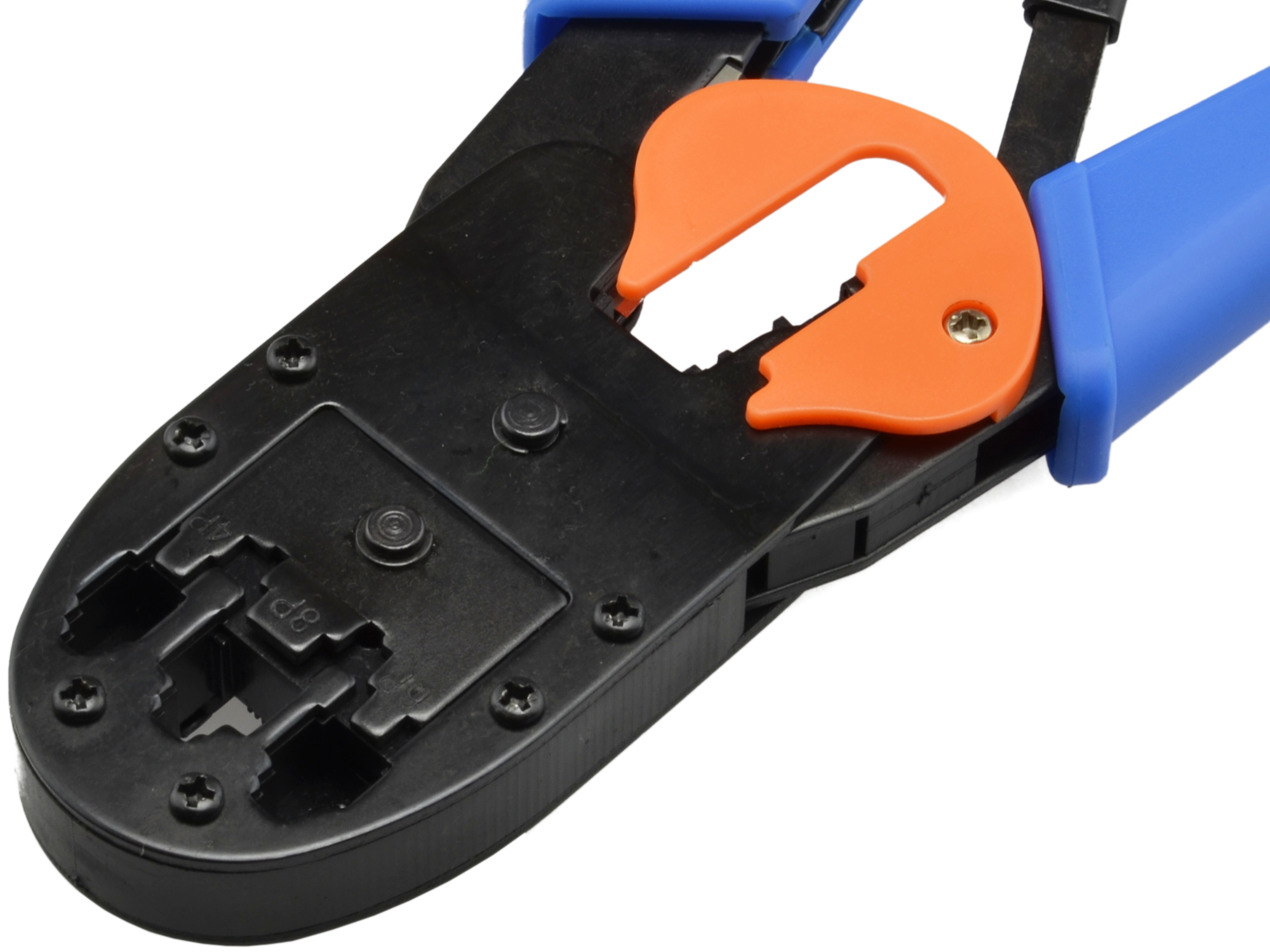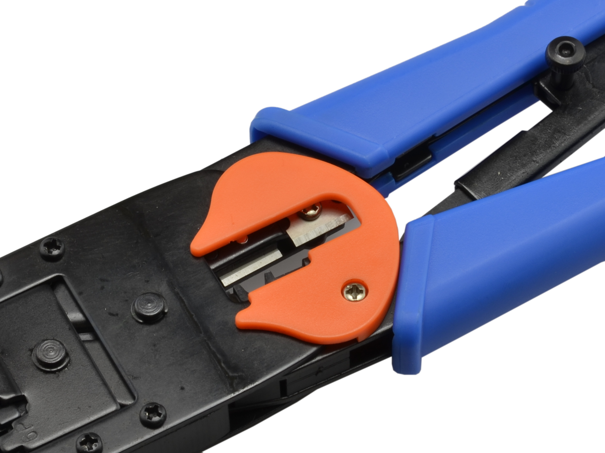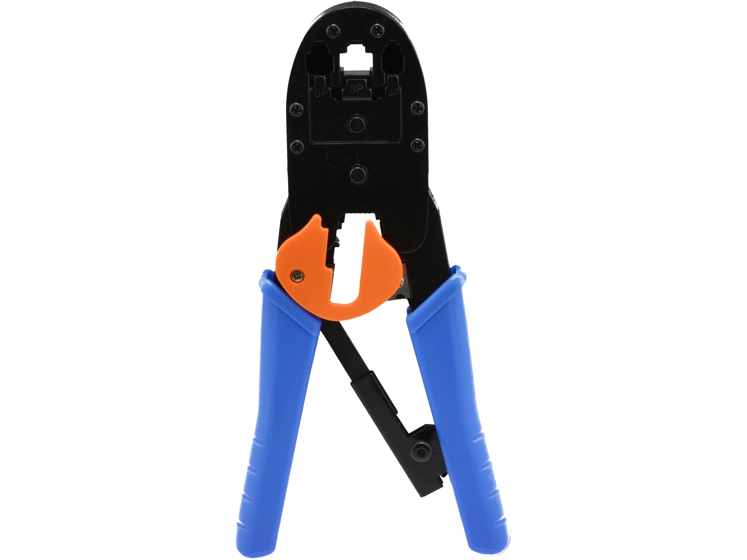 Професійний модульний обтискач вилки, використовується для обтискання 8-контактів, 6-контактів заглушки на штирі кабелю та 4 pin. Точний передній обтискний механізм забезпечує рівномірний тиск на всі штифти. Обтискач також оснащений різаком і знімачем ізоляції для плоских і круглих кабелів.