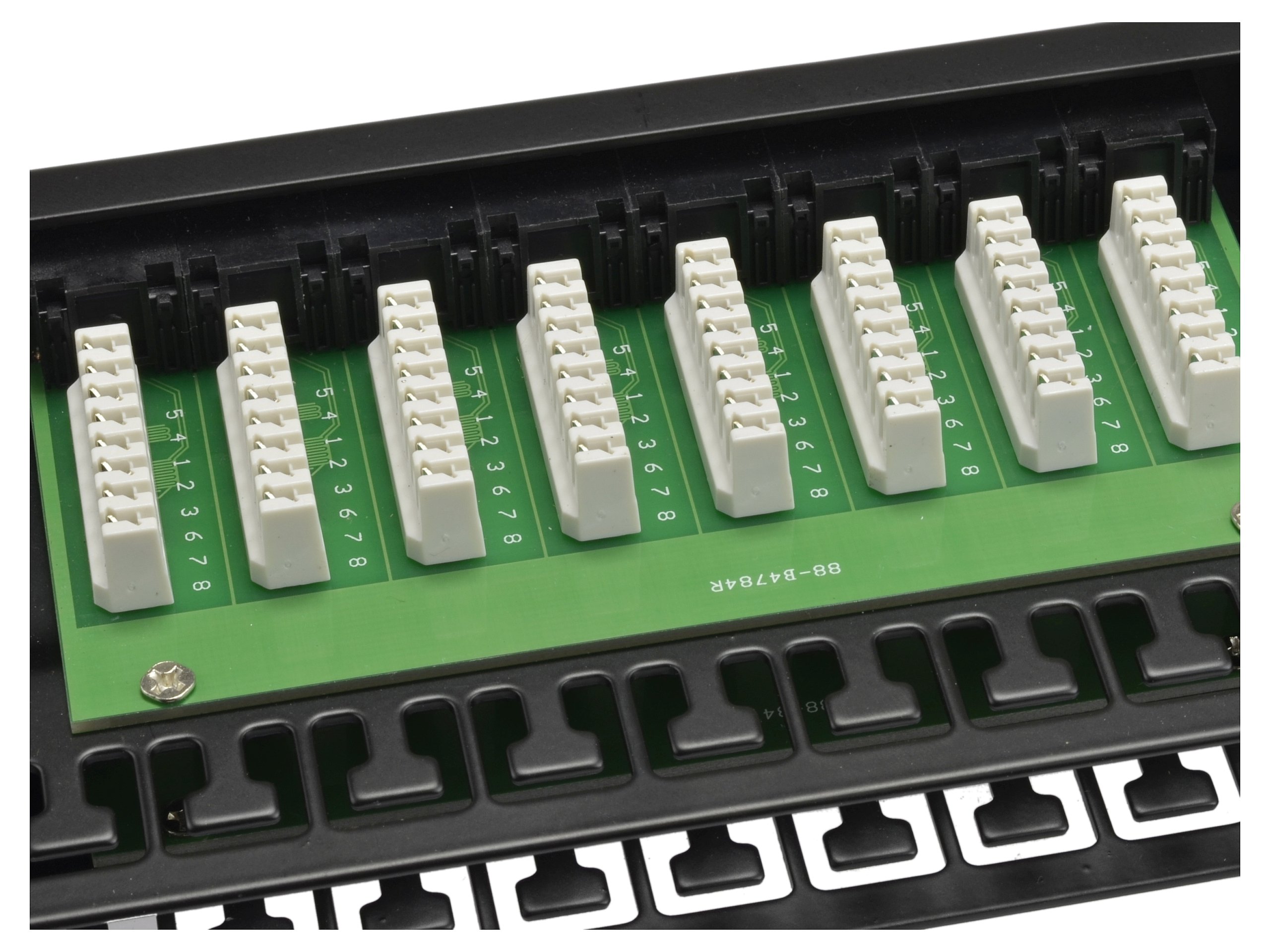 - З’єднувачі LSA зі щілинами, позначені для встановлення за допомогою витої пари відповідно до EIA/TIA 568A/B