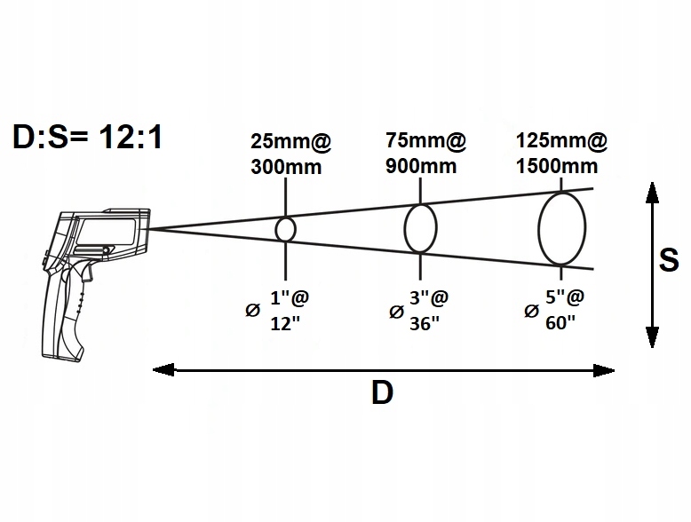 Для представленого пірометра оптика 12:1, тому пляма буде в 12 разів меншою за відстань від об’єкта.