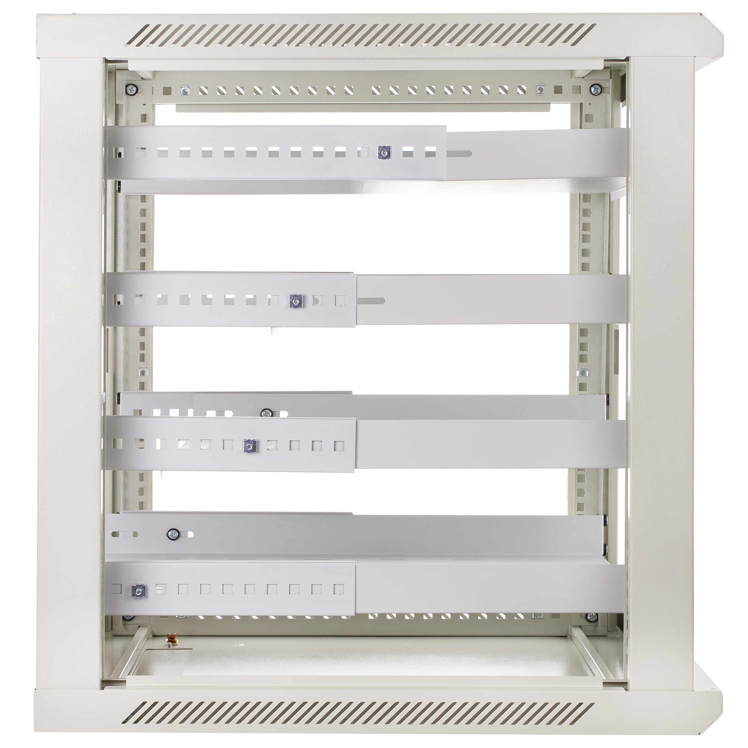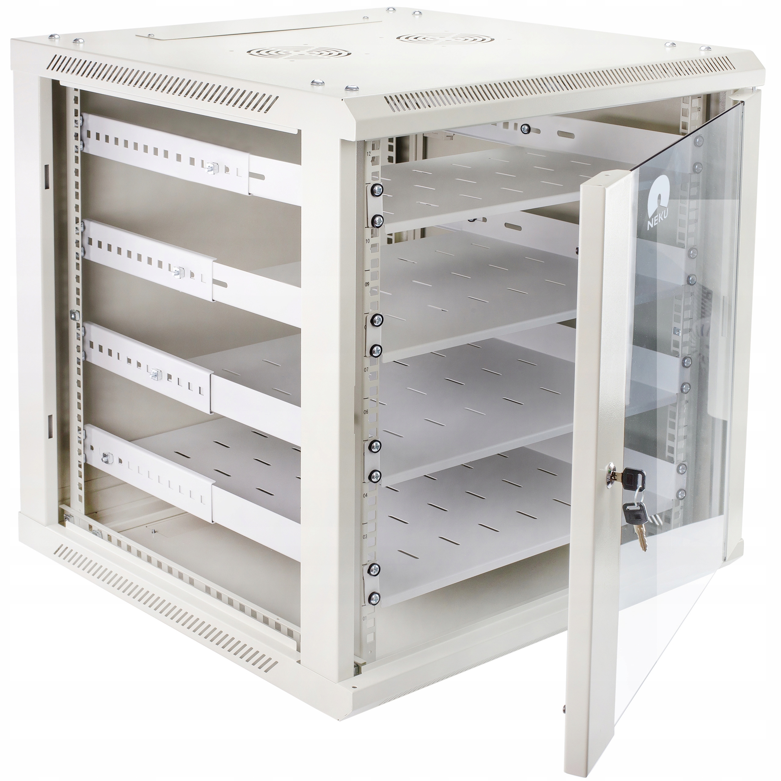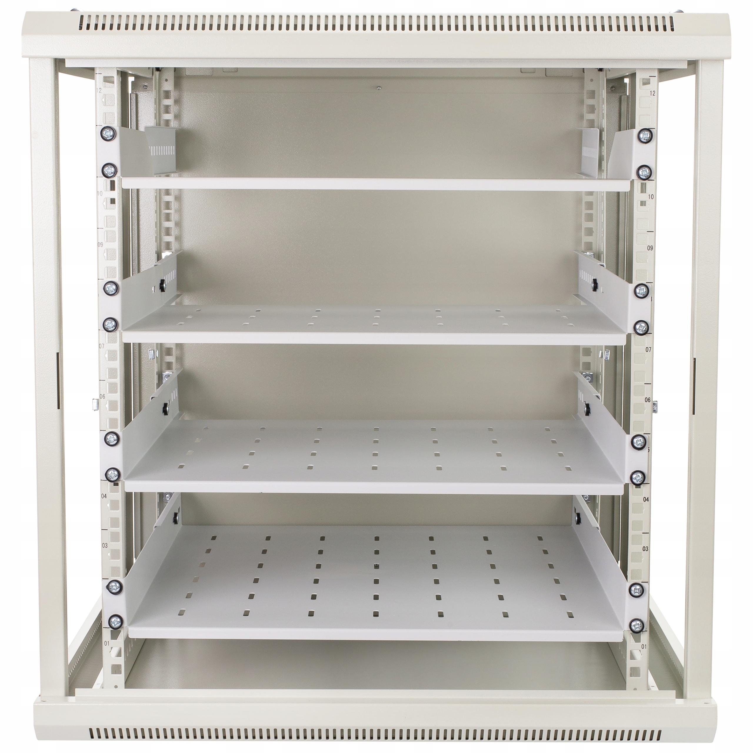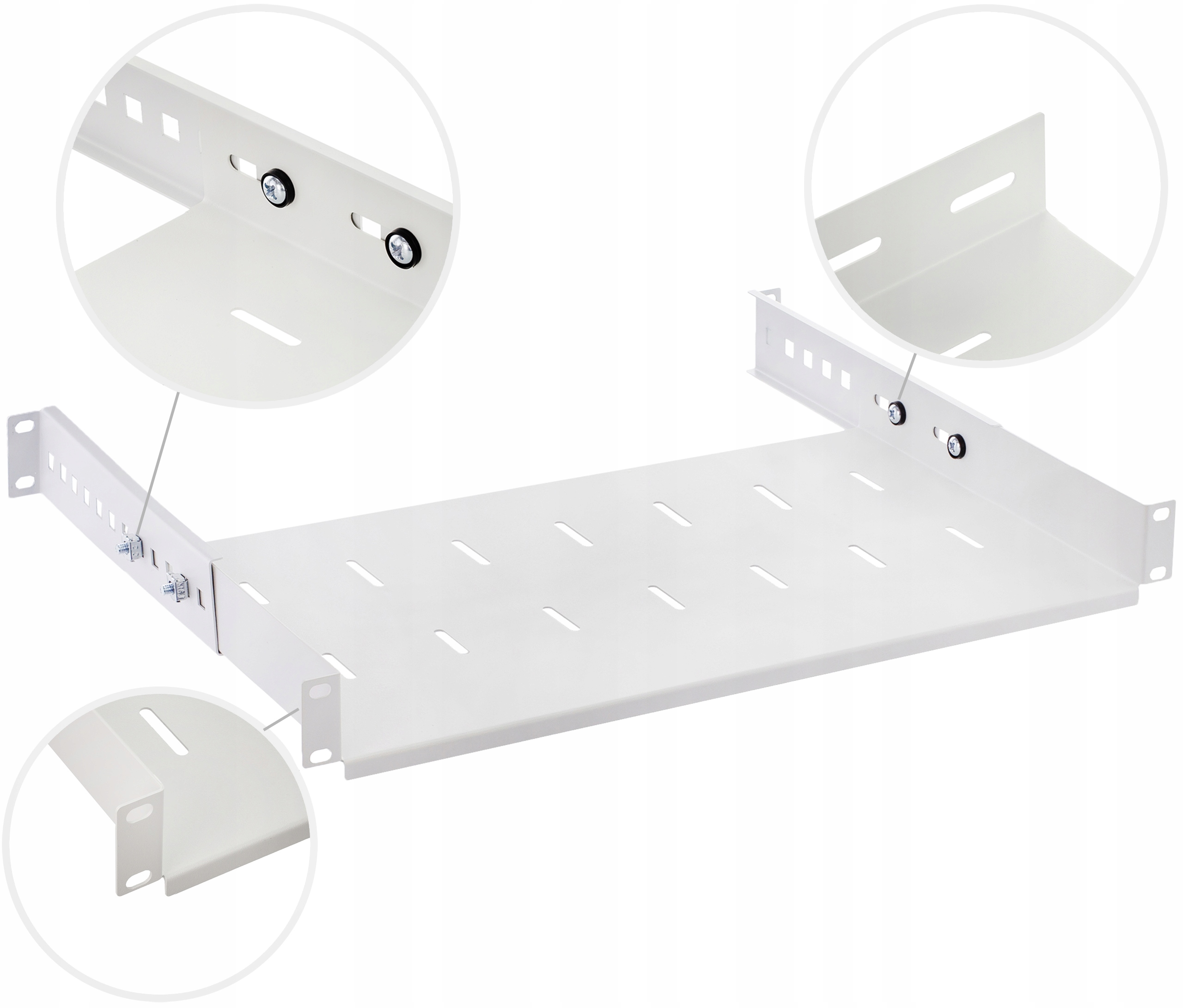 The Перевагою регульованих полиць НЕКУ є підвищена жорсткість і несучість, що дозволяє розміщувати на них важкі пристрої. Також встановлення полиць у чотирьох точках опори з регульованою глибиною (до 150 мм) підвищує їхню корисність у серверних шафах.