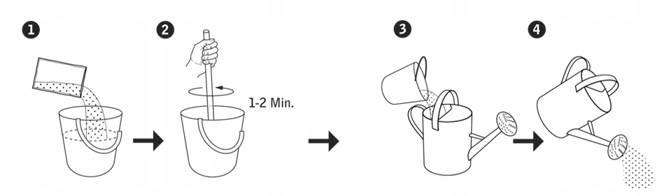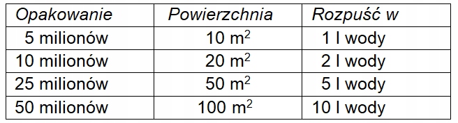 Розчиніть вміст упаковки в 1-10 літрах води, як показано в таблиці нижче. Промийте пакет, щоб використати всі нематоди. Перемішуйте суспензію до повного розчинення вмісту. Повторюйте перемішування кожні 15 хвилин.