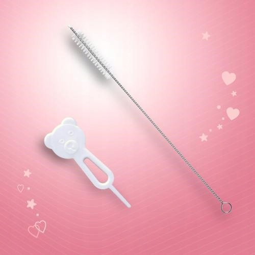 Пляшки Neno постачаються з корисними аксесуарами: щіточка для чищення трубок і голка для розкривання кришки ведмедика. Вони використовуються для ретельного очищення та, можливо, видалення залишків густого соку з поплавця.