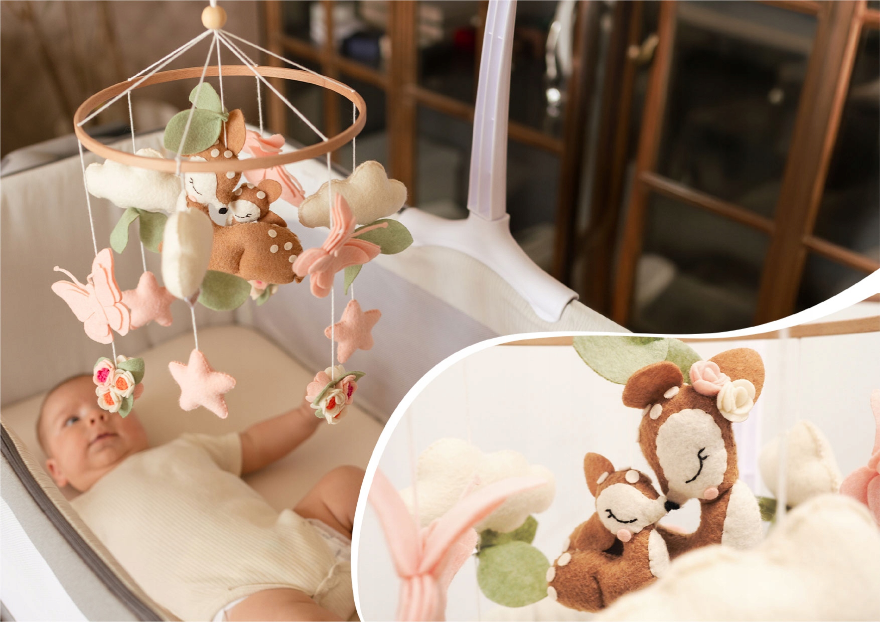 М'яко рухливі підвіски у формі оленів і метеликів привертають увагу малюка, навчаючи його спостерігати за рухами. Це природний спосіб розвитку зору та концентрації.