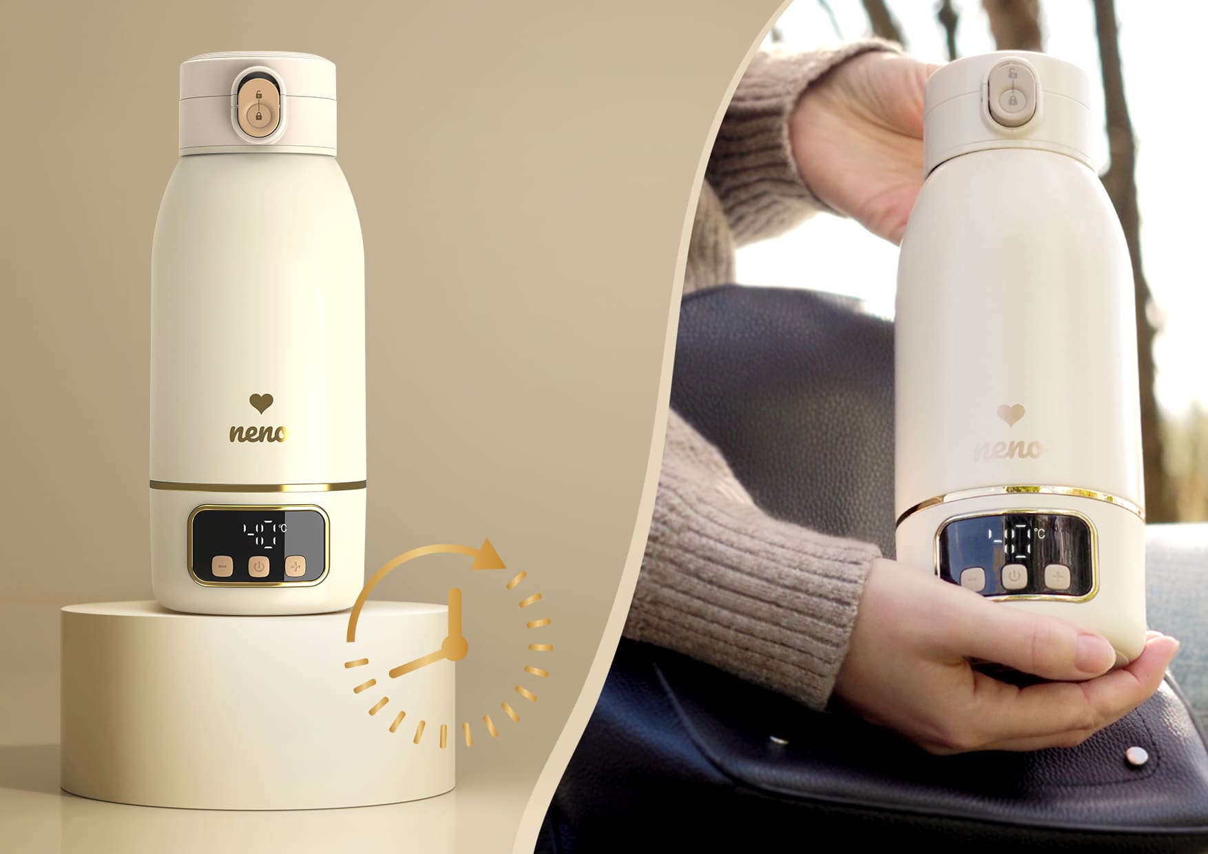 Neno Savia - це бездротовий обігрівач, який ідеально підходить для подорожей та під час повсякденних виходів. Він швидко нагріває молоко або воду, підтримуючи їх температуру, і одна зарядка дозволяє нагрівати рідину вісім разів. Завдяки легкій, компактній конструкції, зручній ручці та щільному закритті, ви можете взяти його всюди.