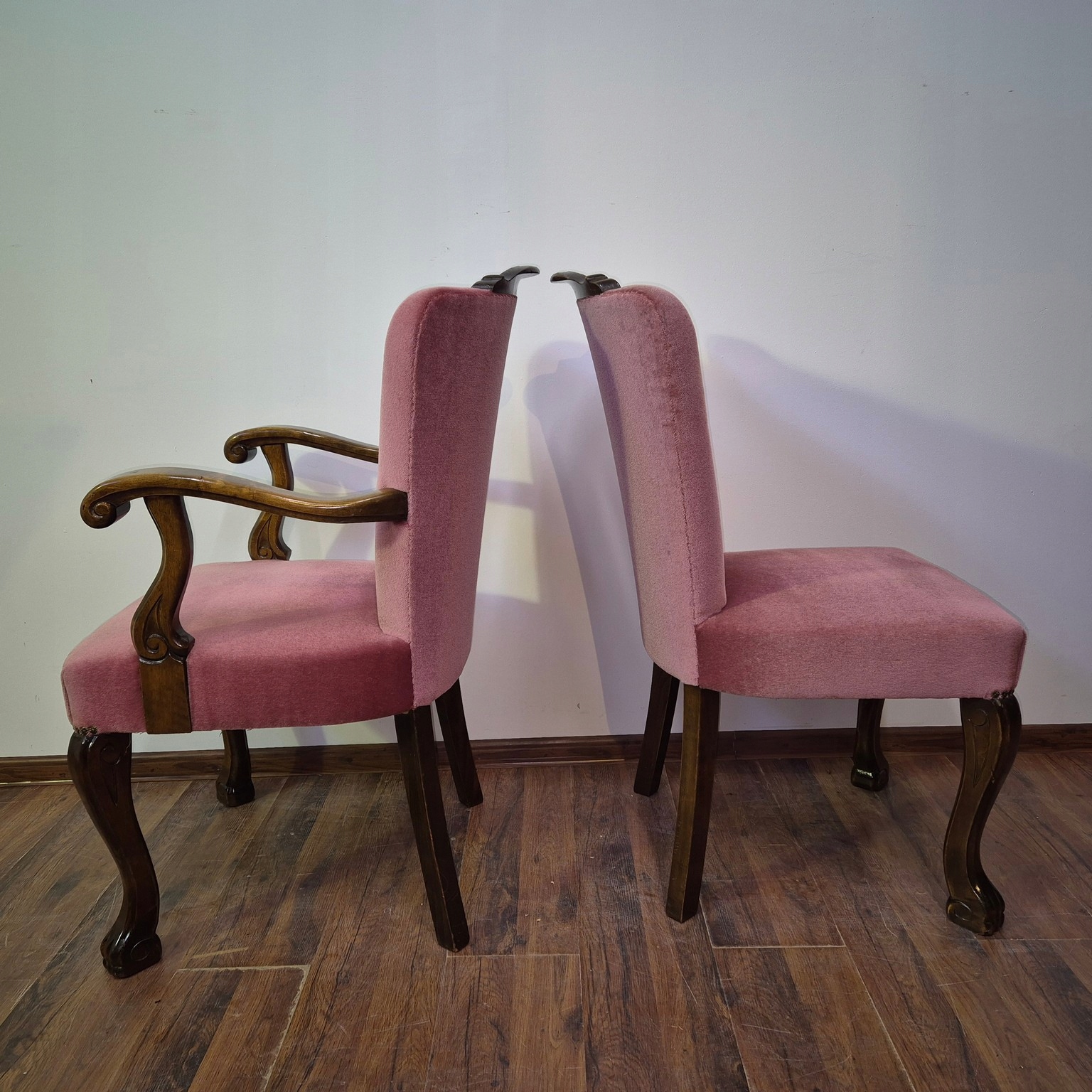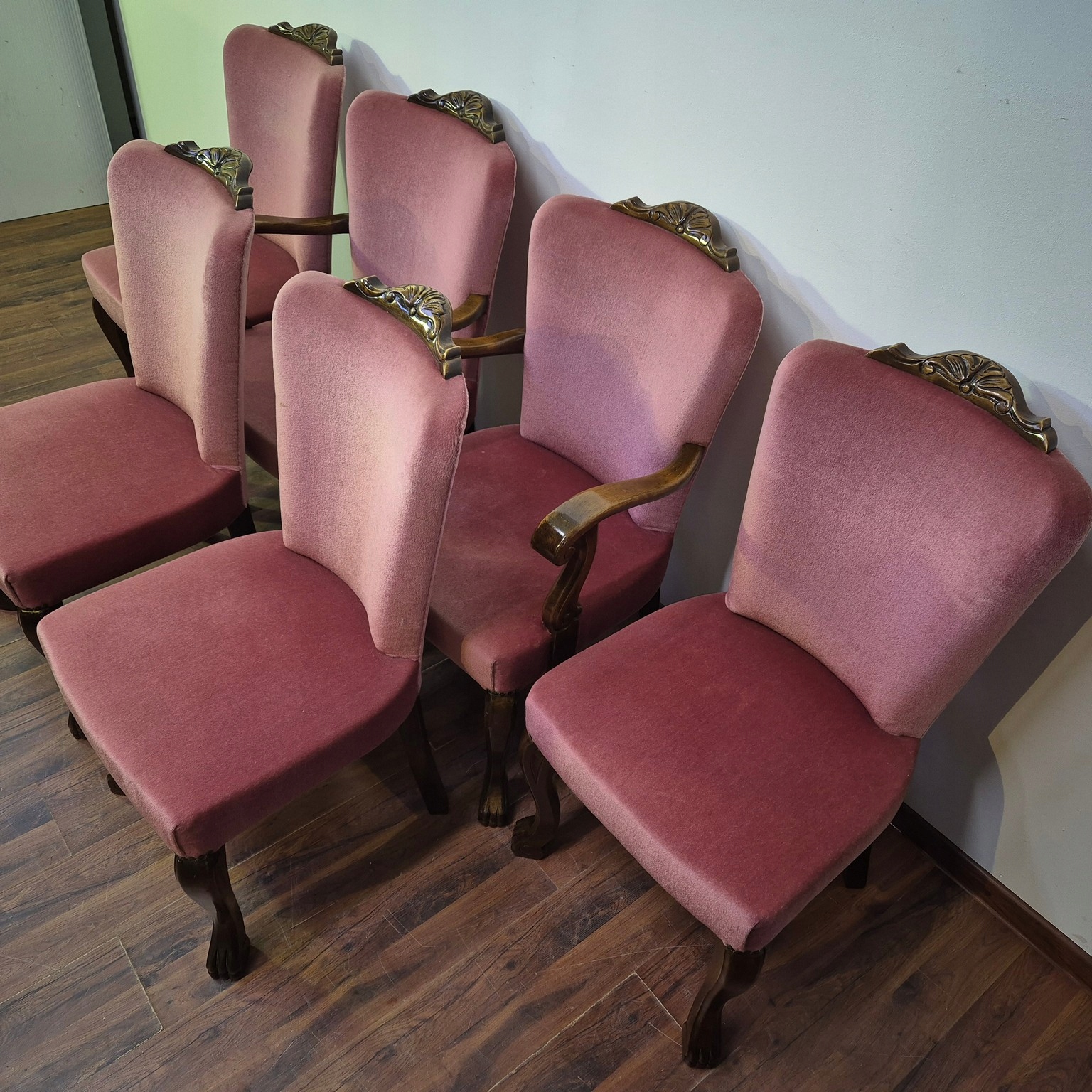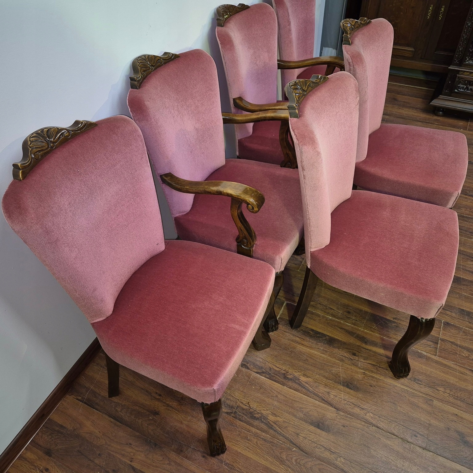 Прекрасний набір левів Леви дуже масивні. Складний таблиця. 4 стільці та 2fotels. Куплет, виготовлений з горіхової деревини. Країна походження Франція. Стабільні стільці, сидіння пружин, велюровий оббитковий матеріал