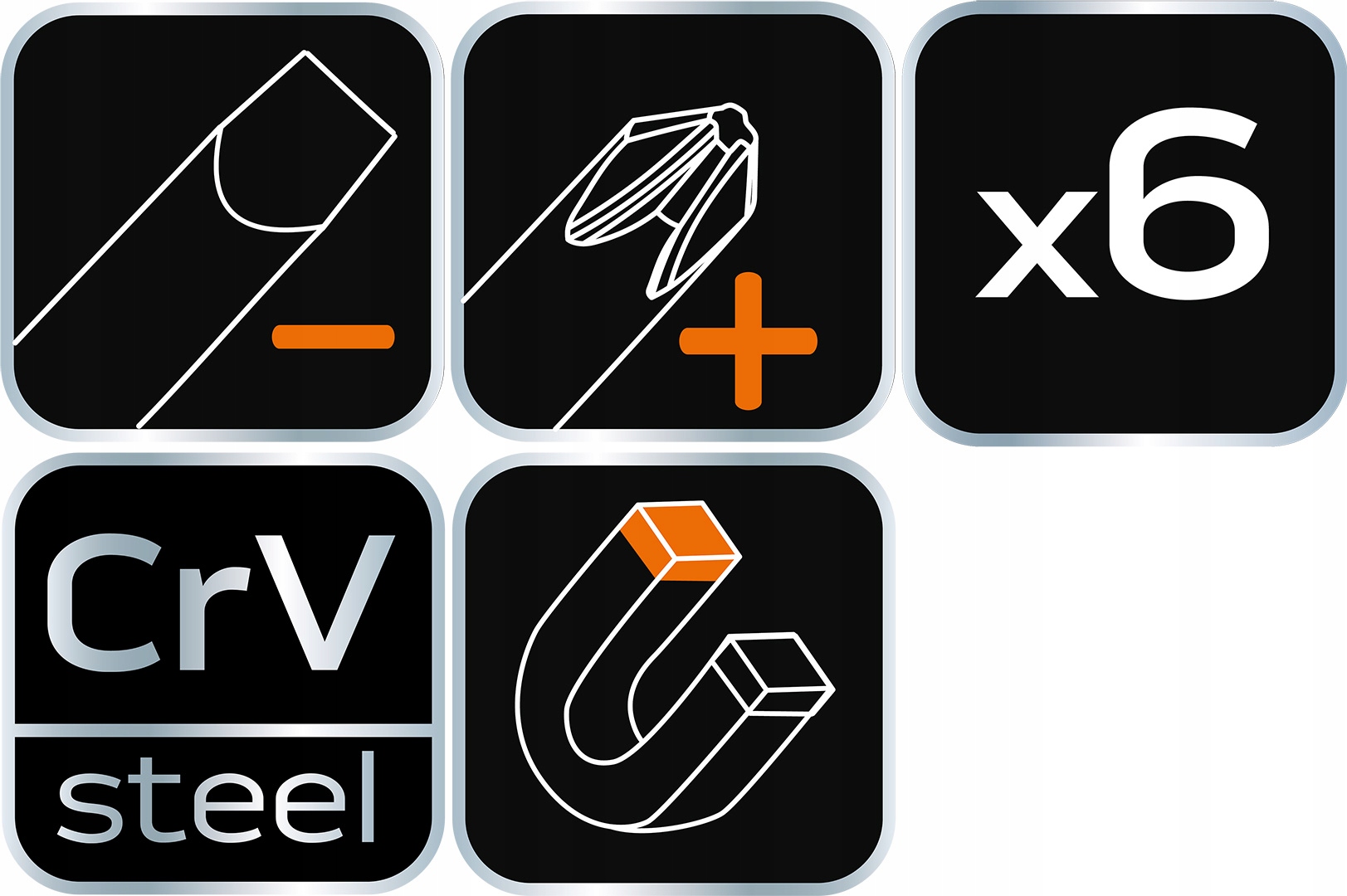 набір викрутки Neo (посилання 04-193) містить 6 викруток: плоский і хрест. Викрутка виготовлена з міцної сталі CRV. Викрутка має магнітний наконечник. Тригранарна форма ручки з профільованою опорою для великого пальця зменшує навантаження руки під час роботи та полегшує отримання оптимального крутного моменту. Подвійна сміттєва ручка запобігає ковзанню в руці, вона стійка до хімічних речовин, масел та мастильних матеріалів. Щоб зробити бренд NEO, відповідати очікуванням професіоналів.