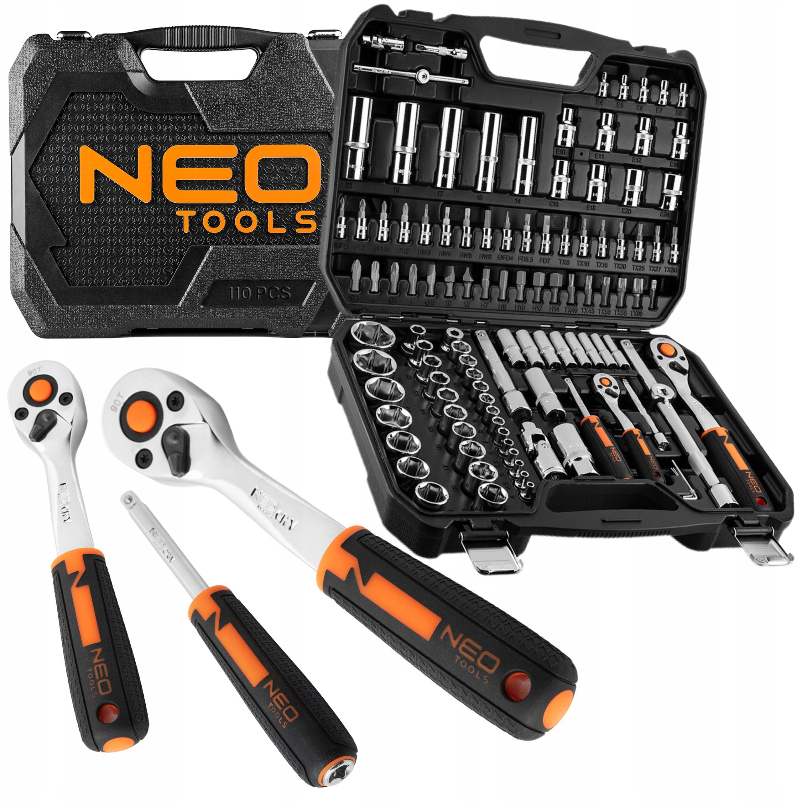 Набір торцевих ключів 1/2" і 1/4" NEO (арт. № 10-066) складається з 110 елементів виготовлені з високоякісної хромованадієвої сталі. У комплект входять тріскачки 1/2" і 1/4" (міцний храповий механізм - 90 зубів) з вигнутими ергономічними ручками. У набір входить багатий пакет шестигранних головок двох довжин, з тисненими написами (розміром від 4 до 32 мм), головки Torx (E4 - E24) і насадки для викрутки (плоскі, хрестові, шестигранні, Torx). Все це доповнюється широким асортиментом аксесуарів. Вертикальне розміщення елементів у валізі дозволяє швидше зібрати необхідний комплект. Ключі поставляються в практичному і міцному пластиковому футлярі з металевими засувками і зручною ручкою. Надійність продукції підтверджується 25-річною гарантією та сертифікатом TÜV Rheinland M+T. Торгова марка NEO відповідає очікуванням професіоналів.