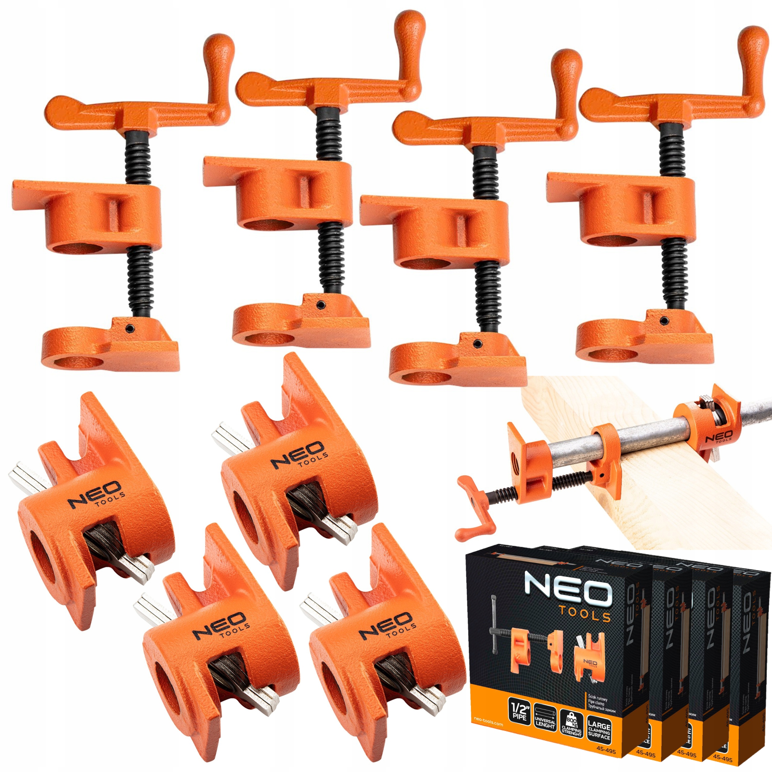 Набір із 4 шт. Хомут трубний 1/2" 45-495 NEO - нескінченний хомут, призначений для використання зі сталевими трубами DN 15/R будь-якої довжини та діаметром ½". Сила затиску вирівнюється до ваги 800 кг Його можна використовувати для стабілізації дерев'яних елементів, які використовуються, наприклад, у столярній майстерні.
