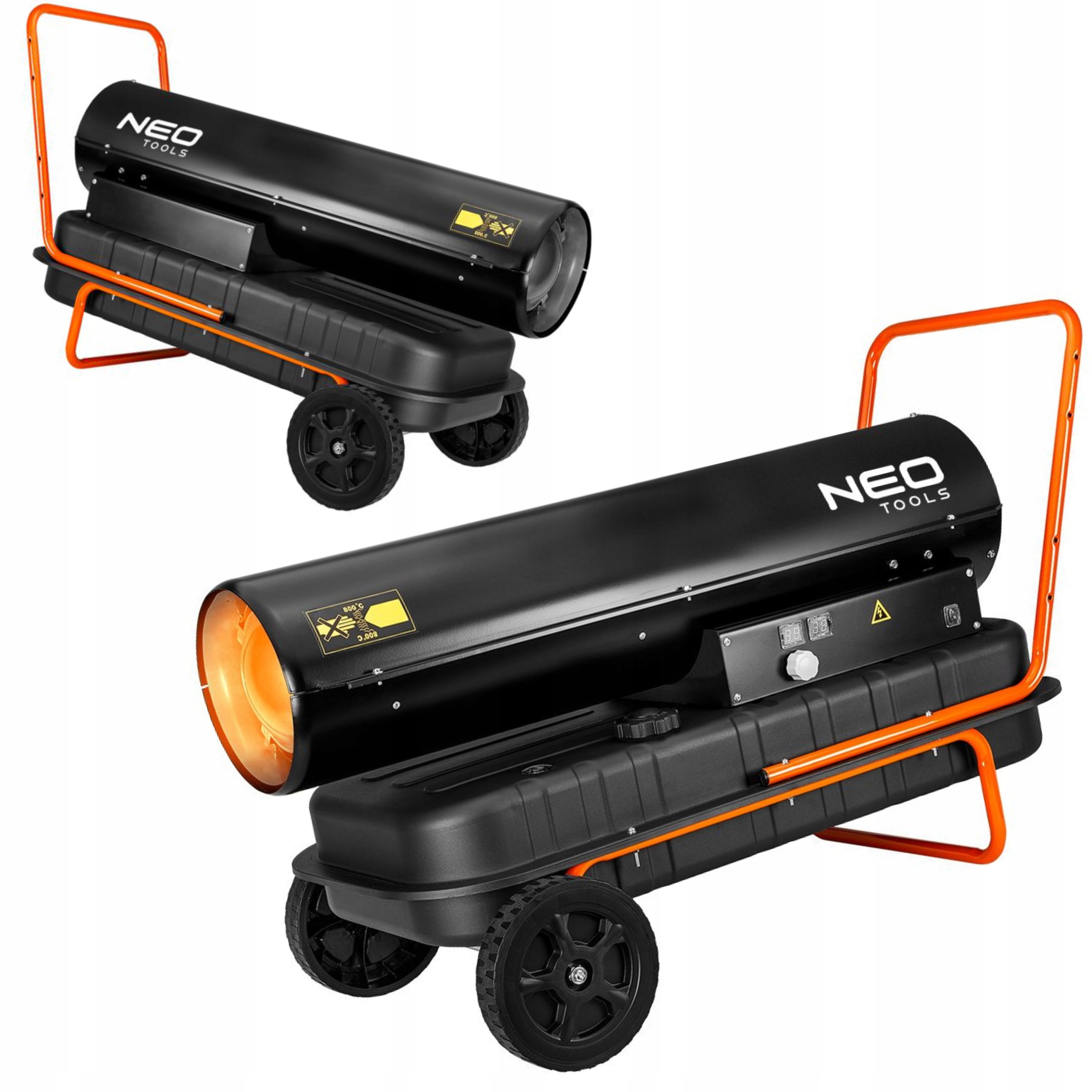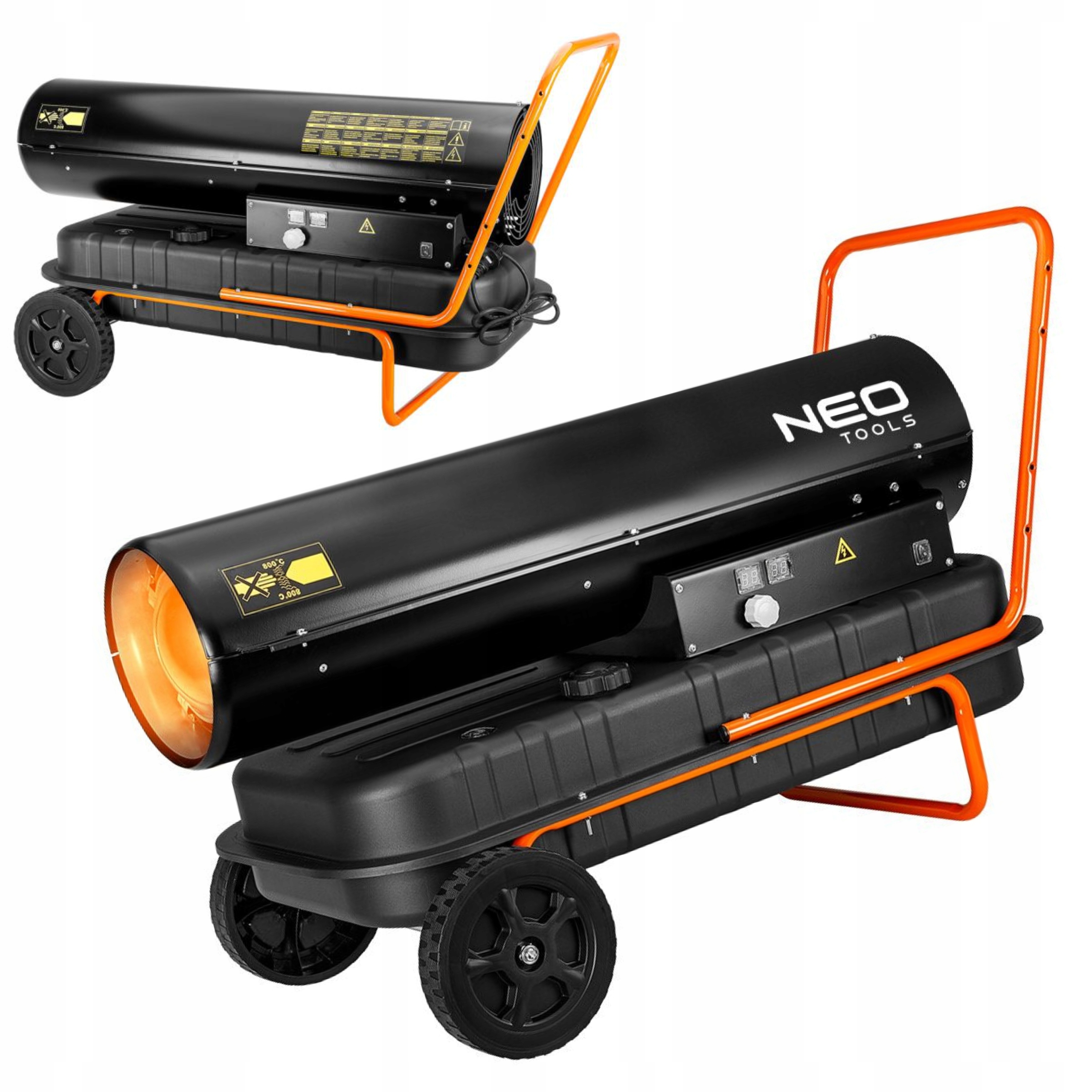 Масляний обігрівач 50 кВт, бак 50 л, колеса NEO 90-082 потужністю 50 кВт, оснащений термостатом і регулятором температури. Має вентилятор з витратою повітря 1100 м3/год. Працює на гасі або дизельному паливі, має витрату 4,7 л/год. Паливний бак об'ємом 50 л Обігрівач розрахований на переміщення, не має коліс. Простий у використанні, з міцним металевим корпусом і міцною конструкцією. Датчик полум'я відключає живлення, якщо виявляє брак масла, а світловий індикатор несправності впливає на безпеку використання пристрою. Обігрівач оснащений кабелем довжиною 1,3 м. Його вага становить 22,7 кг, а розміри 640 x 1090 x 517 мм. Знадобиться на будмайданчиках, в залах і складах.