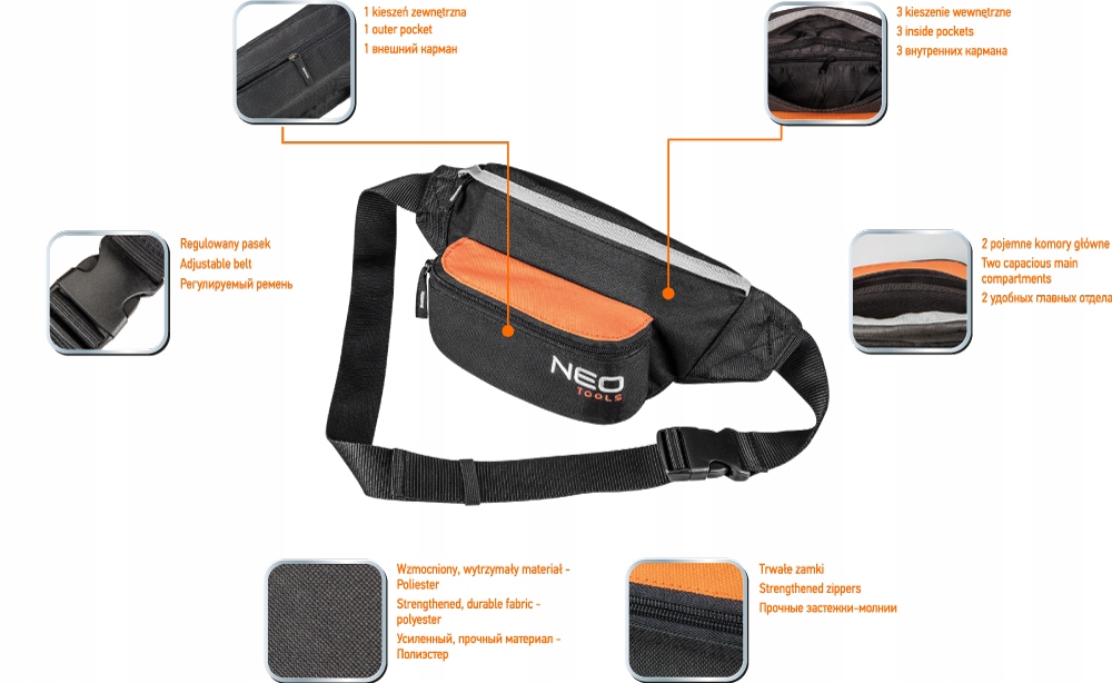 Нео кишеня з армованого поліестеру. Має два містких основних відділення, одне з яких додатково оснащено кишенею на блискавці. Задня кишеня підвищує зручність використання виробу. Регульований, застібається, зручний ремінь з пластиковою пряжкою полегшує використання.