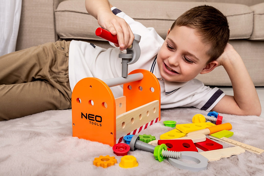 Безпечний, екологічний і розвиваючий набір дерев'яних інструментів для дітей від торгової марки NEO. Це іграшка, яка дозволяє тренувати координацію рухів вашого малюка, допомагає йому вивчити основні назви інструментів (та їх використання), а також навчити їх поєднувати окремі елементи один з одним.