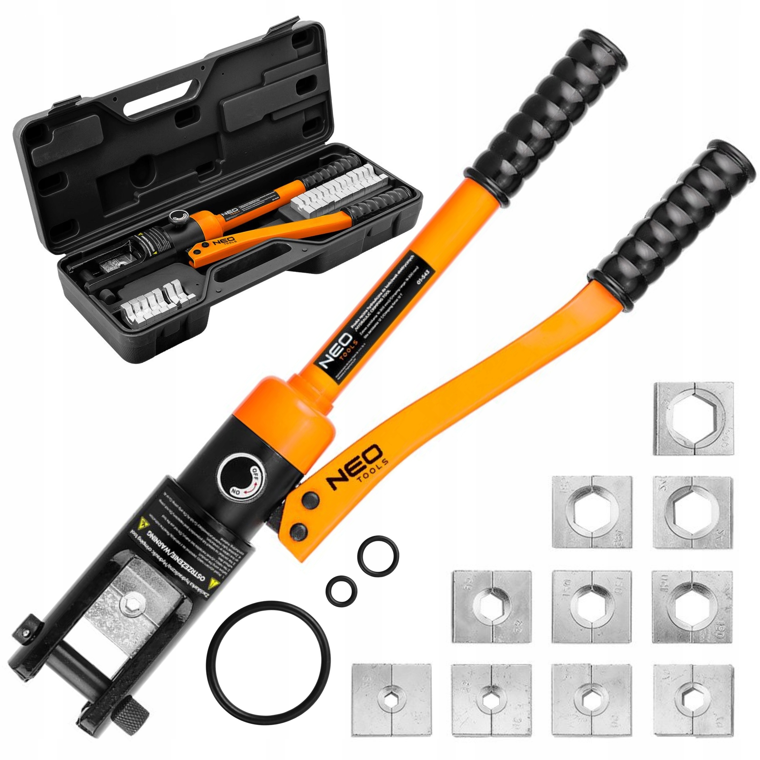 Ручний гідравлічний обжимник NEO для електричних клем 16-300 мм 01-543 - це прес для обтискання електричних клем і сталевих канатів. Характеризується розмірами затискних губок: 16, 25, 35, 50, 70, 95, 120, 150, 185, 240, 300 мм². Інструмент має загальну довжину 480 мм і тип затискача гексогенний. Він досягає сили пресування 12 тонн. Хід відбувається через кожні 20 мм. Корпус преса виготовлений з вуглецевої сталі. Він оснащений роздільною затискною матрицею, головкою приводу, що обертається, стопорним штифтом, що фіксує матриці, поршнем, головним клапаном приводу, ергономічними ручками та рухомою рукояткою приводу. Інструмент полегшує обтиск, оскільки забезпечує набагато більше зусилля, ніж потрібно клемам. Прес бренду NEO рекомендований професіоналам і любителям DIY.