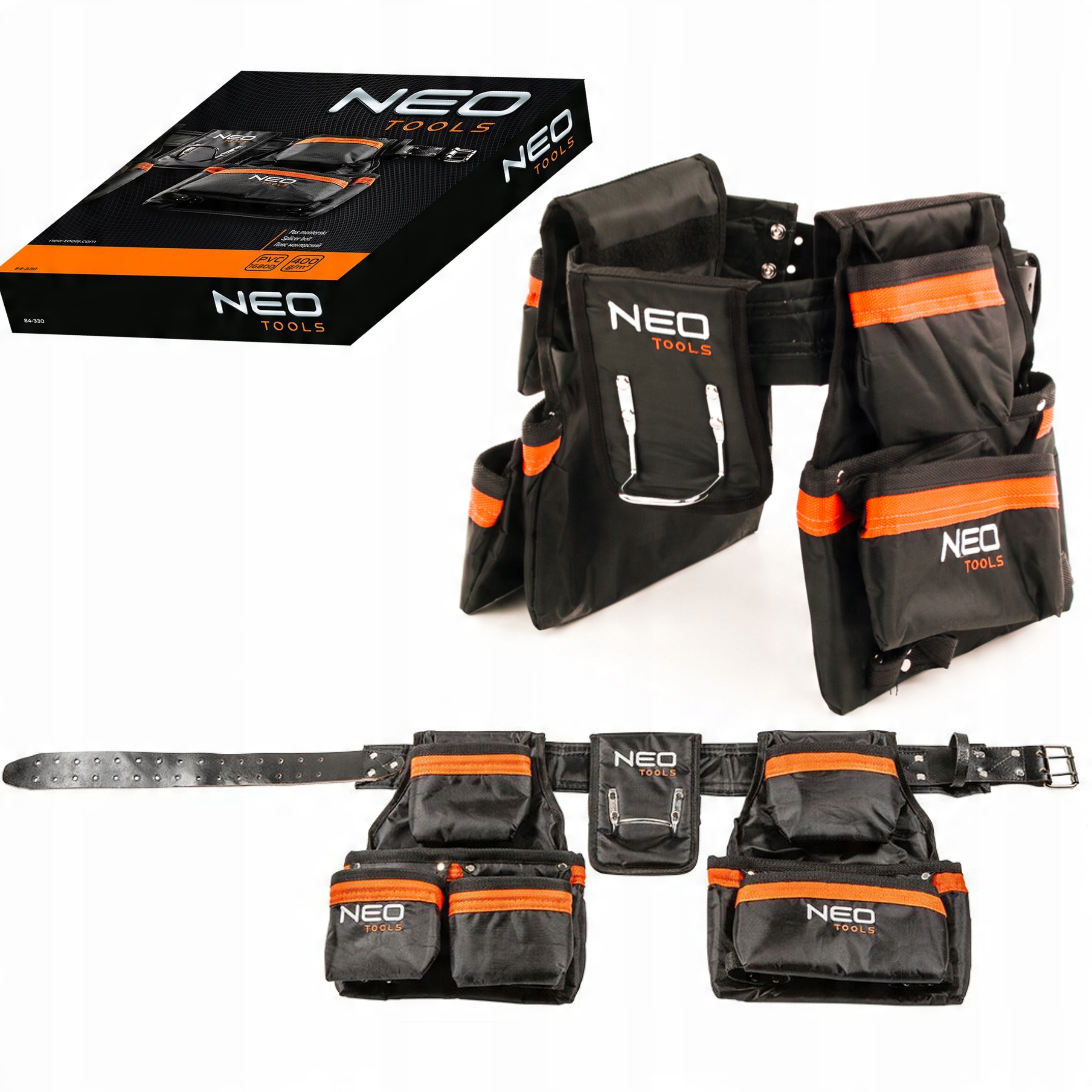 Ремінь слюсарний NEO з натуральної шкіри. На поясі є посилені кишені, які дозволяють носити велику кількість інструментів або аксесуарів. Має міцний ремінь з регульованою окружністю, що дозволяє легко адаптувати його до фігури користувача
