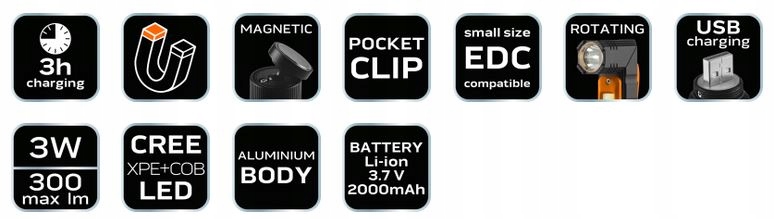 Він оснащений сучасним світлодіодом CREE XPE і COB зі світловим потоком 300 люмен і потужність 3 Вт.