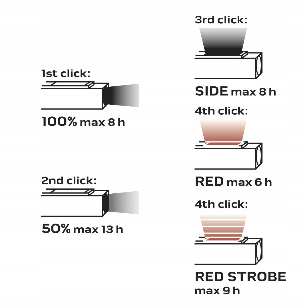 Режими роботи 100% ліхтарик, 50% ліхтарик , бічний ліхтар 100%, бічний ліхтар червоний, бічний стробоскоп