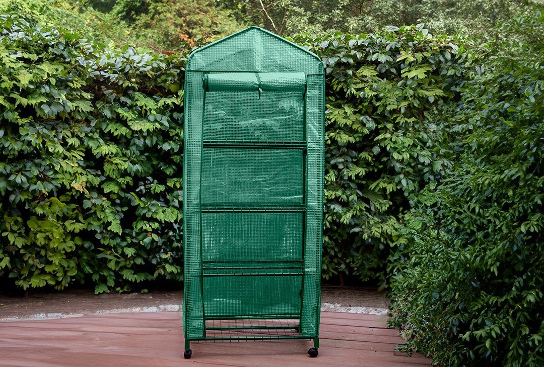 Парниковий 69 x 49 x 160 см, PE фольга, металева конструкція, колеса 15-903 Neo Tools -це складна, універсальна теплиця, в якій можна успішно вирощувати трави або невеликі фруктові рослини. Він характеризується розмірами 69 х 49 х 160 див. Він був виготовлений з металевого порошку, пофарбованого та PE 135 г фольги. Він закритий блискавкою. Він має чотири полиці та передній отвір, розміром 49 х 138 див. Оранжерея Neo Tools має можливість прокатати передню стіну для зволоження або перевірити рослини. Проста і швидка збірка полегшує його передачу та зберігання. Оранжерея є мобільним завдяки чотирьох колесах на 360 градусів. У двох з них є гальмо, яке тримає теплицю в потрібному місці.