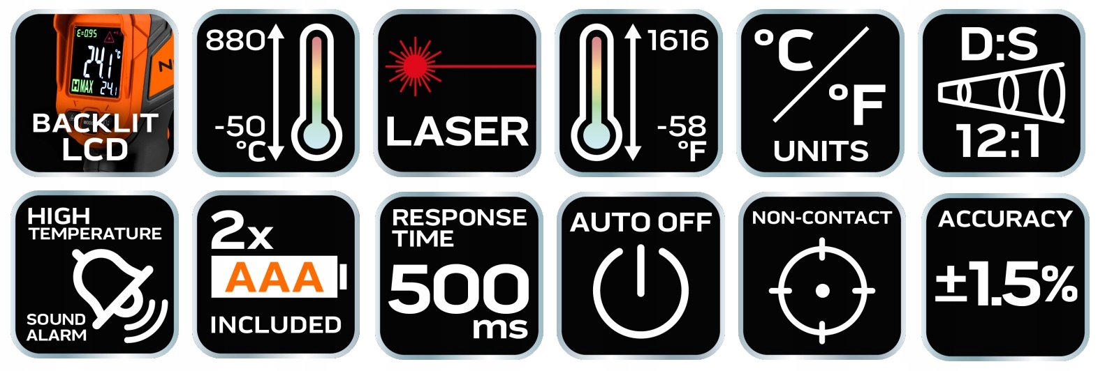 Пірометр, прилад для оцінки температури (C-50~880, F-58~1616) 75-276 компанії NEO — це прилад для безконтактного вимірювання температури поверхні об’єктів з високою точністю, до +/- 1,5% + 1°C в діапазоні від -50 до 880°C.