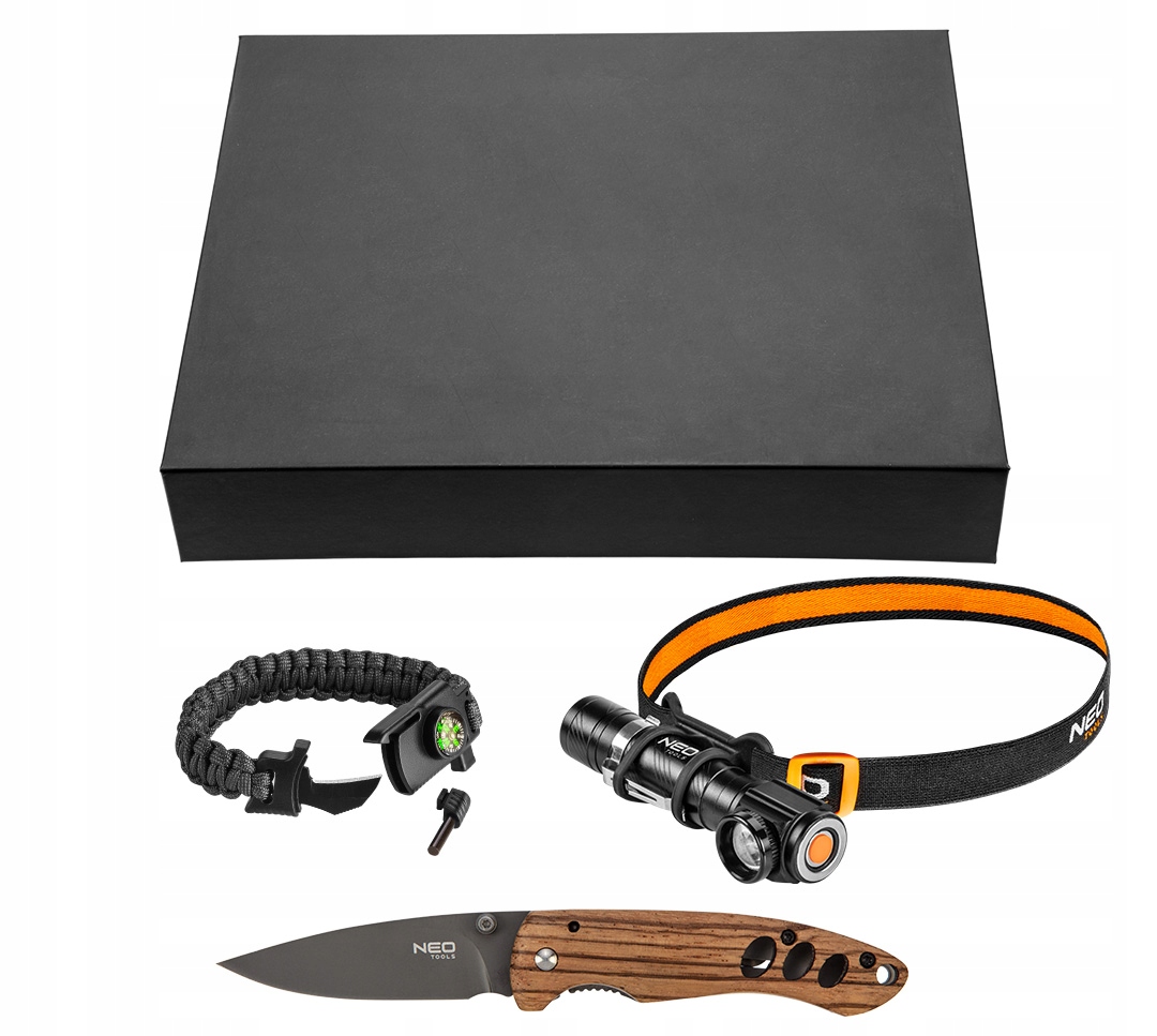 Набір із 3 елементів (налобний ліхтар 99-026, браслет виживання 5-в-1 63-140, складаний ніж) 63-033 від NEO – це набір, який включає, серед іншого: для акумуляторної налобної лампи 99-026 NEO потужністю 10 Вт і макс. Характеризується радіусом дії до 150 м і вбудованим світлодіодом Cree XML T6. Має зум і 3 функції освітлення: 100%, 50% і стробоскоп. Живиться від літій-іонного акумулятора ємністю 1200 мАг 3,7 і заряджається через USB через штекер, розташований під кришкою. Час зарядки 4 години, час роботи 3 години. Ліхтарик оснащений наголов'ям. Завдяки можливості зняття з ручок має більш широке застосування. Пропонує затиск для кишені. У набір також входить браслет для виживання 5 в 1, до складу якого входить мотузка з паракорду, розпалювач, компас, ніж і свисток. Мотузка розмотується на довжину до 3,5 м, а її міцність оцінюється в 250 кг. Ширина браслета 26 мм, а окружність 240 мм. Розміри розпалювача вогню, що входить у комплект, становлять 5 x 20 мм. Браслет зелений. Третій елемент набору - ніж довжиною 16,5 см. Оснащений дерев'яною ручкою і лезом з нержавіючої сталі - він підходить для багатьох ситуацій. Титанове покриття леза зміцнює його, а фіксатор леза забезпечує безпечне використання. Затиск для кишені дозволяє зручно закріпити інструмент на одязі. Набір з 3 елементів від NEO призначений для туристів, любителів активного відпочинку та любителів DIY.