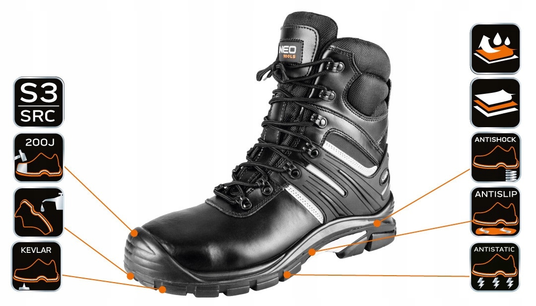 Високі робочі черевики NEO - це гарантія безпеки, комфорту та модного дизайну, навіть для щоденного використання. Взуття належить до захисної категорії S3 SRC, що відповідає суворим вимогам до завдань, для яких воно призначене.