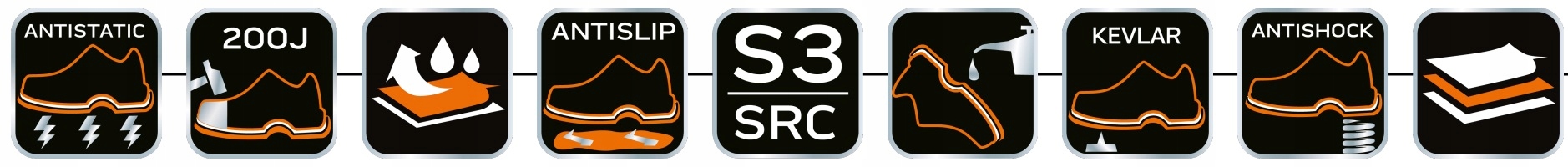 Взуття має два -матеріал підошви та висока >стійкість до масел, бензину та інших органічних розчинників. Вони забезпечують антистатичні властивості та захищають пальці від ударів з енергією до 200 Дж. Крім того, вони характеризуються стійкістю до ковзанняна керамічній підкладці, покритій розчином лаурилсульфату натрію (SLS), і сталевій підкладці, покритій з гліцерином.