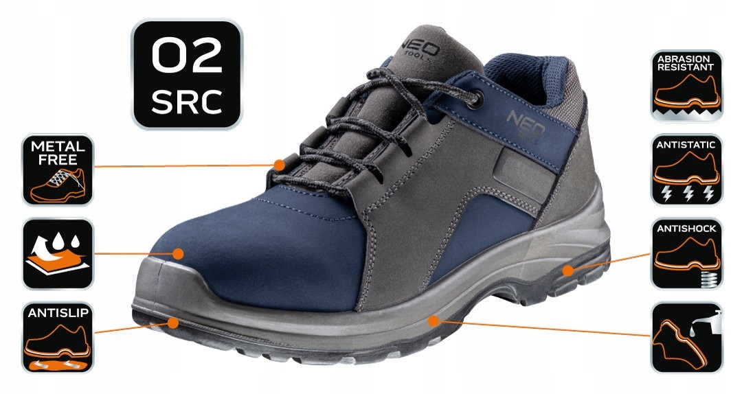 Професійне взуття 82-740 NEO клас O2 SRC захищає стопу від холоду, м'якість і водопоглинання. Взуття дуже зручне, виготовлене з високоякісної шкіри нубук і всередині оздоблено сіткою. Підошва виготовлена з матеріалу, який робить верхній шар м'яким і комфортним, нижній шар захищає підошву від стирання - підошва стійка до дизельного палива. Взуття ідеально захищає нарощену п'яткову частину (поглинання енергії).