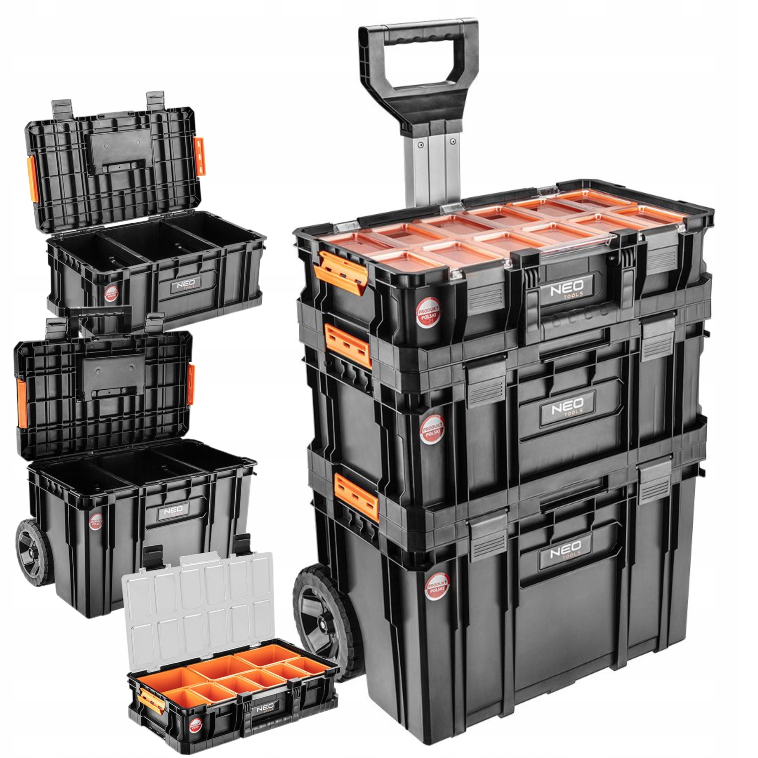 Модульний набір для транспортування та зберігання різного інструменту. У комплект входить місткий ящик на колесах з алюмінієвою телескопічною ручкою. Універсальний середній ящик і місткий органайзер зі знімними контейнерами. У набір входить 9 знімних контейнерів двох розмірів, 4 регульованих відділення, в тому числі одне з тримачами для ручних інструментів
