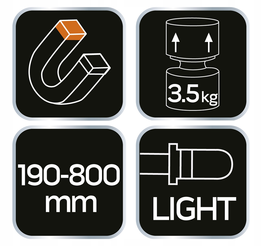 Телескопічний магнітний захват NEO 190-800 мм 11-611 - це інструмент з діапазоном від 190 до 800 мм, вантажопідйомністю 3,5 кг і ергономічною прогумованою ручкою. Захват містить магній, що дозволяє витягувати різні сталеві елементи (гайки, ключі, гвинти) з важкодоступних місць. Він також характеризується практичним світлодіодним ліхтариком, який освітлює простір. Виріб також оснащений затискачем, який дозволяє зберігати грипер у кишені, як звичайну ручку. Він не займає багато місця і ідеально підходить для повсякденних завдань кожного користувача автотранспорту.