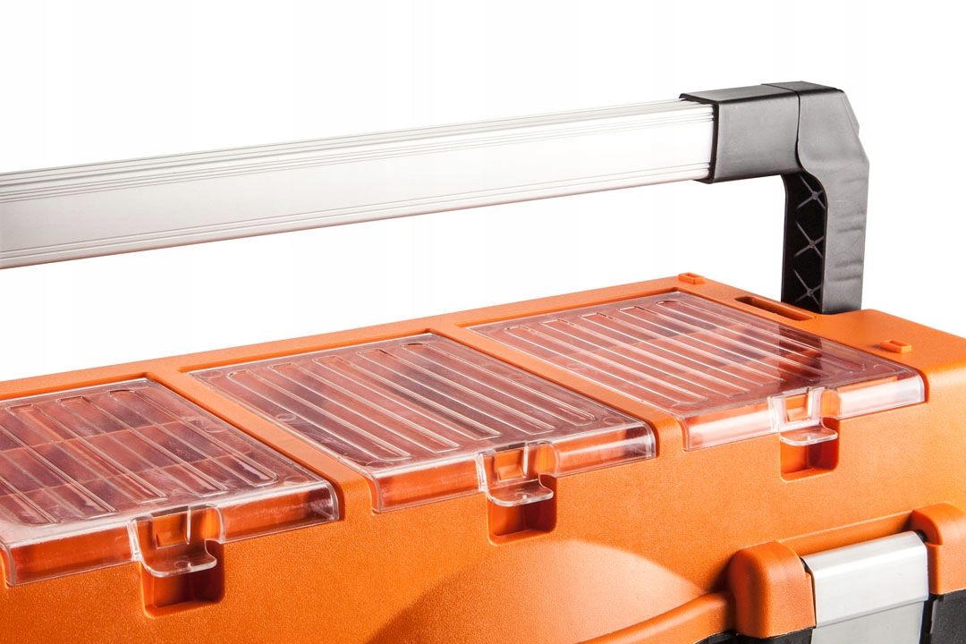 Ящик для інструментів 21" NEO (арт. 84-105) з розмірами 54,7 x 27,1 x 27,8 см. Практичний і надійний ящик для інструментів із міцного пластику з Алюмінієвізастібки мають 2 органайзери для зберігання дрібних речей, розкладний піднос всередині та зручну алюмінієву ручку для перенесення.